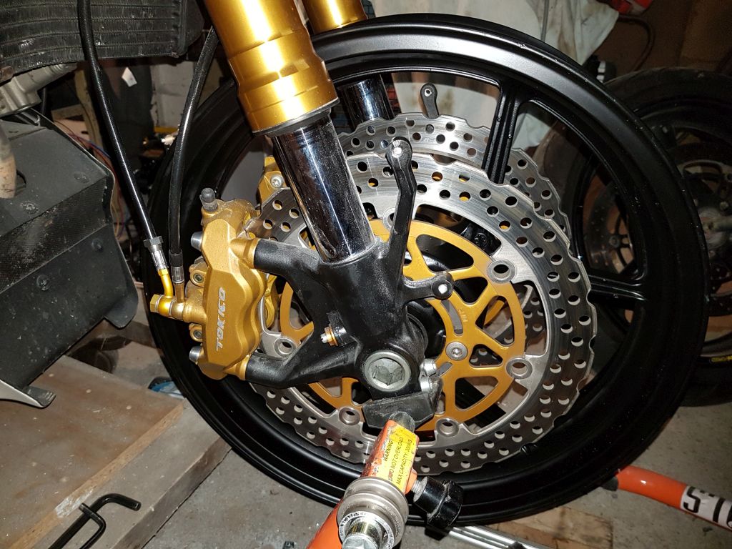 Hallo Gemeinde, denke die goldenen Tokico´s sind immernoch besser wie die Original-SV-Bremsen, außerdem stehen mir mit dem 108er Bolzenabstand später noch verschiedene Varianten zur Verfügung. Auch bei den Scheiben ist alles zwischen Ø 300mm - Ø 320mm möglich. Da ich eh mehr schraube als ich fahre s...