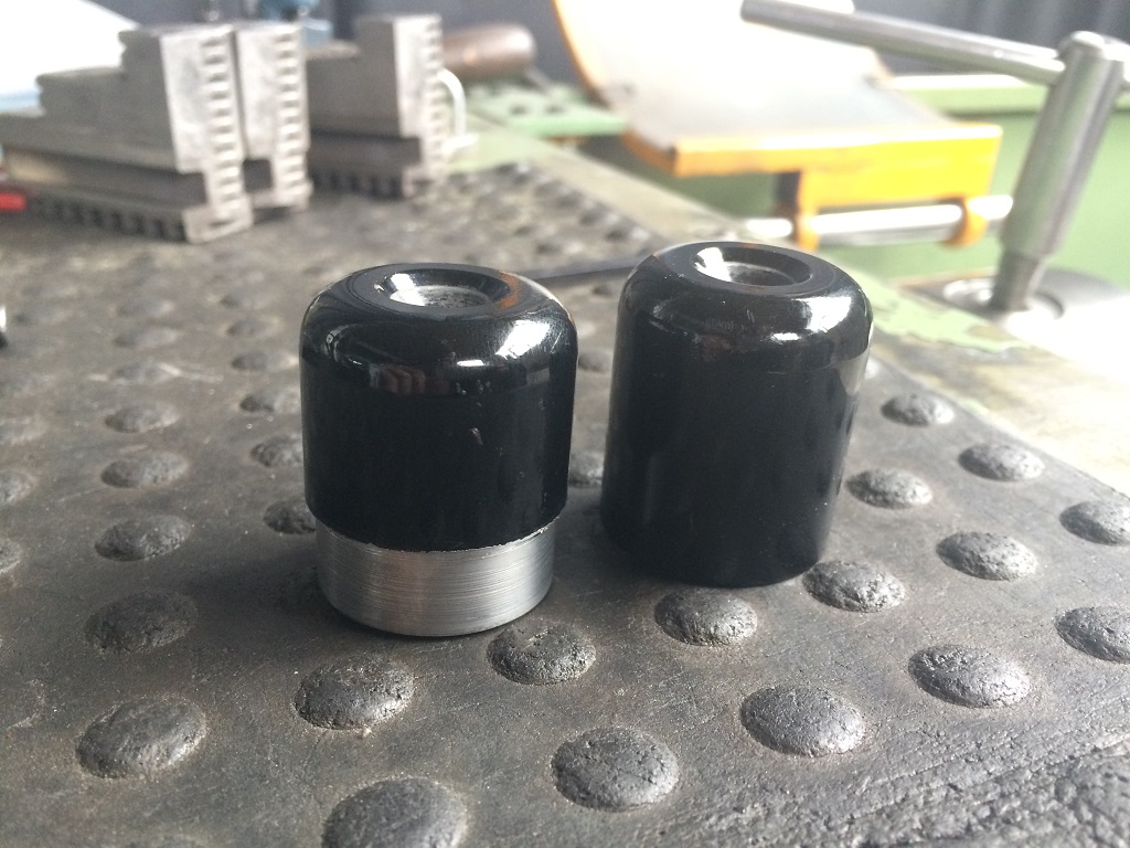 Hier die Original Lenkergewichte, Durchmesser beträgt Original 32mm, die Highsider Spiegel haben maximal 30mm also mussten diese auf der Drehbank etwas bearbeitet werden. Das Ergebnis gefällt mir gut.