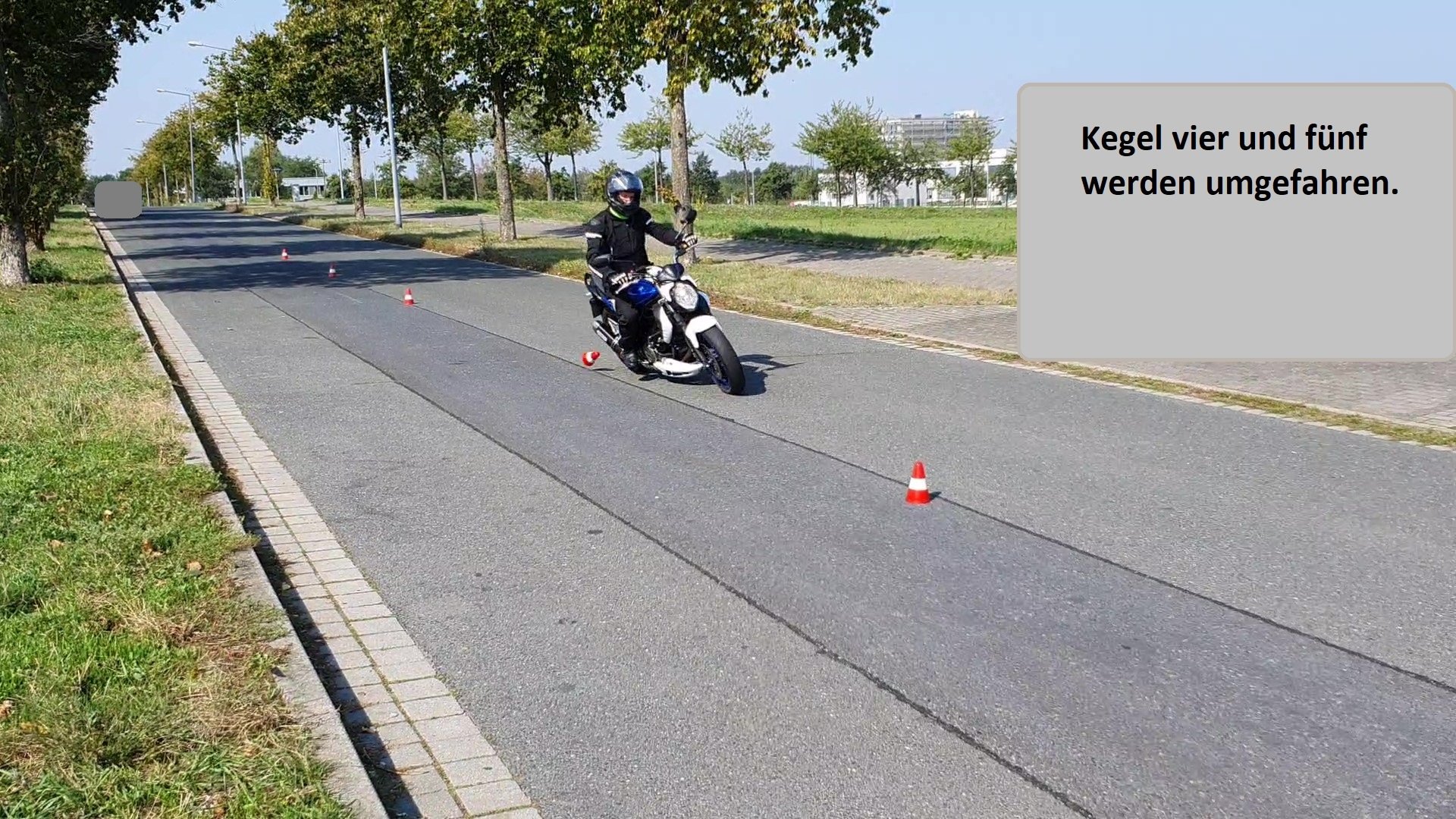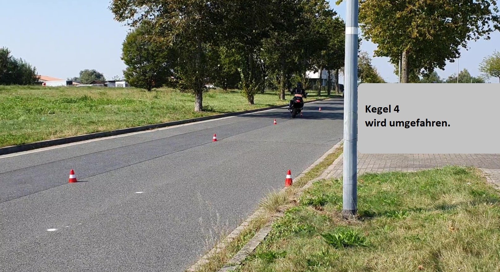 Moin, habs hinbekommen, Fotos aus den Videoaufnahmen des Slaloms zu extrahieren. Aufnahmen sind eine Woche vor der Prüfung nach knapp 40 Fahrstunden. Diese zwei Fotos stammen aus einem Versuch. Kegel 3 bleibt gerade noch stehen. Die letzten nicht mehr.