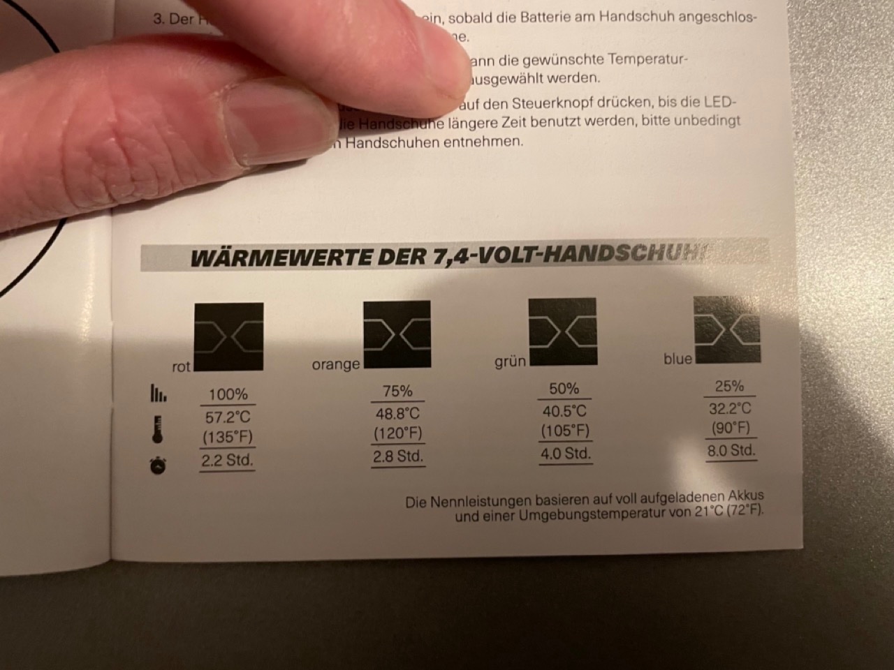 Wobei ich die Angabe mit einer Umgebungstemperatur von 21°C irgendwie reichlich sinnlos finde. Da wären die Handschuhe auch mit ausgeschalteter Heizung viel zu warm. Aber da wird die Akkuleistung wahrscheinlich deutlich höher sein als bei -10°C und deshalb macht es sich besser im Prospekt...