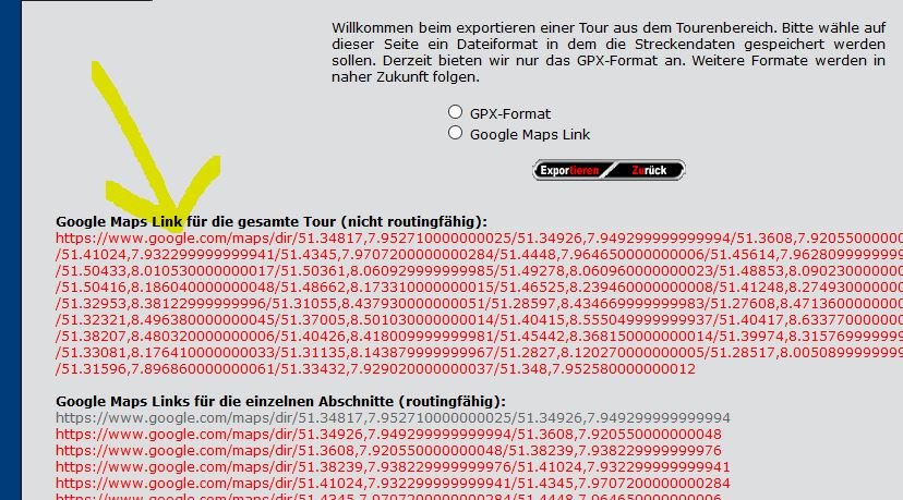 Im Tourenbereich eine anklicken und schauen ob der Link zu Google Maps funktioniert und die Tour dort angezeigt wird. Beim TE springt nach Klick zwar zu maps aber die Tour wird nicht angezeigt.