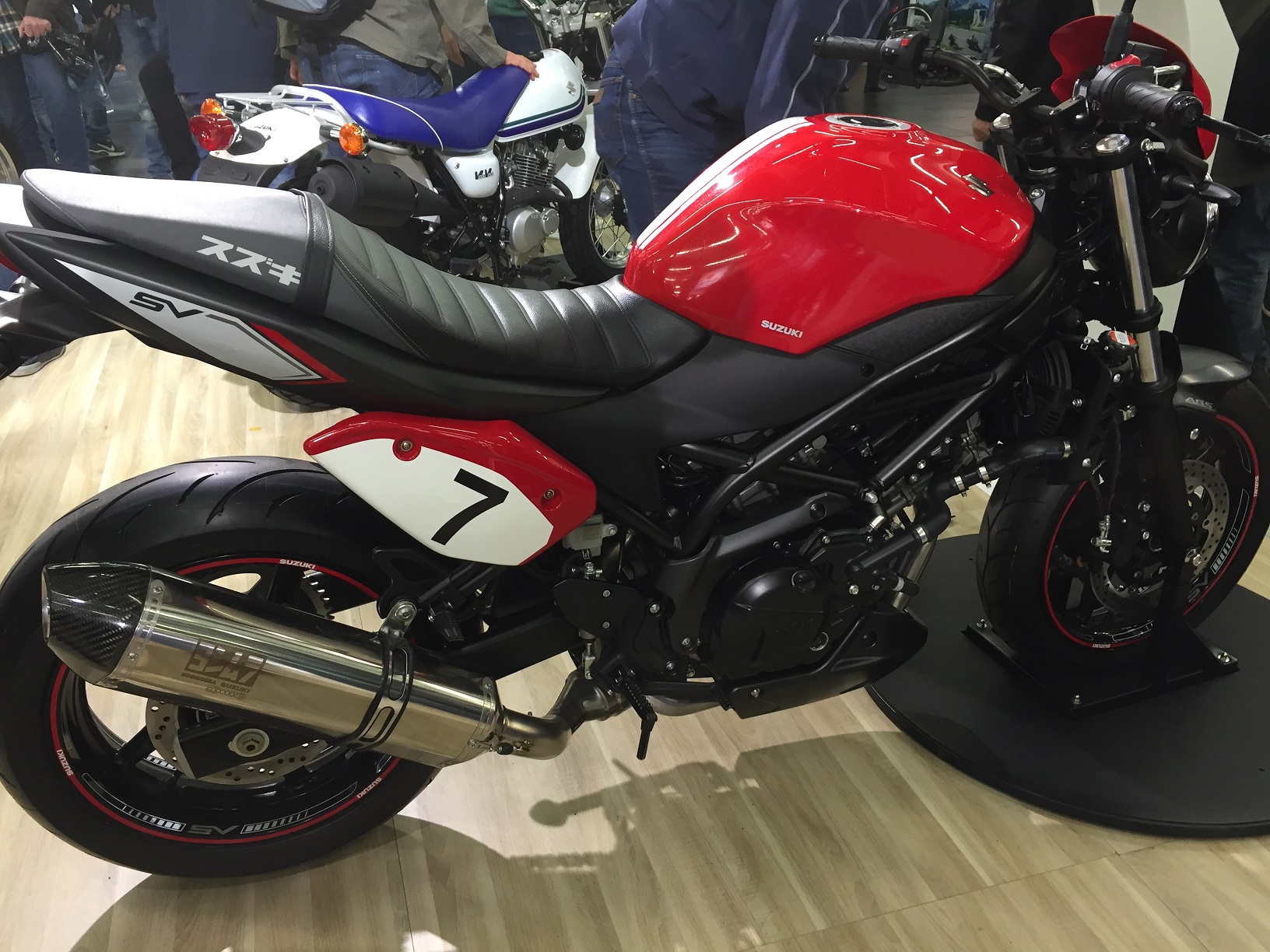 am Wochenende war auf der iMot in München neben der nornmalen SV auch eine etwas modifizierte Variante mit Yoshimura Slip On, LED Blinkern, Flyscreen und Sitzbank zu bewundern.
