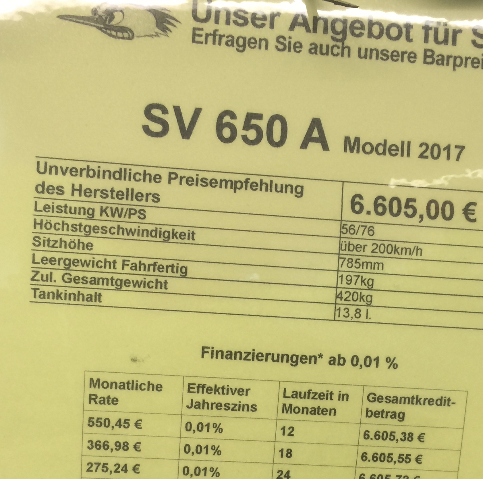 gestern auf der BikeZ in Hannover stand die neue SV 650 auch kostet 6605€ komischer Preis.