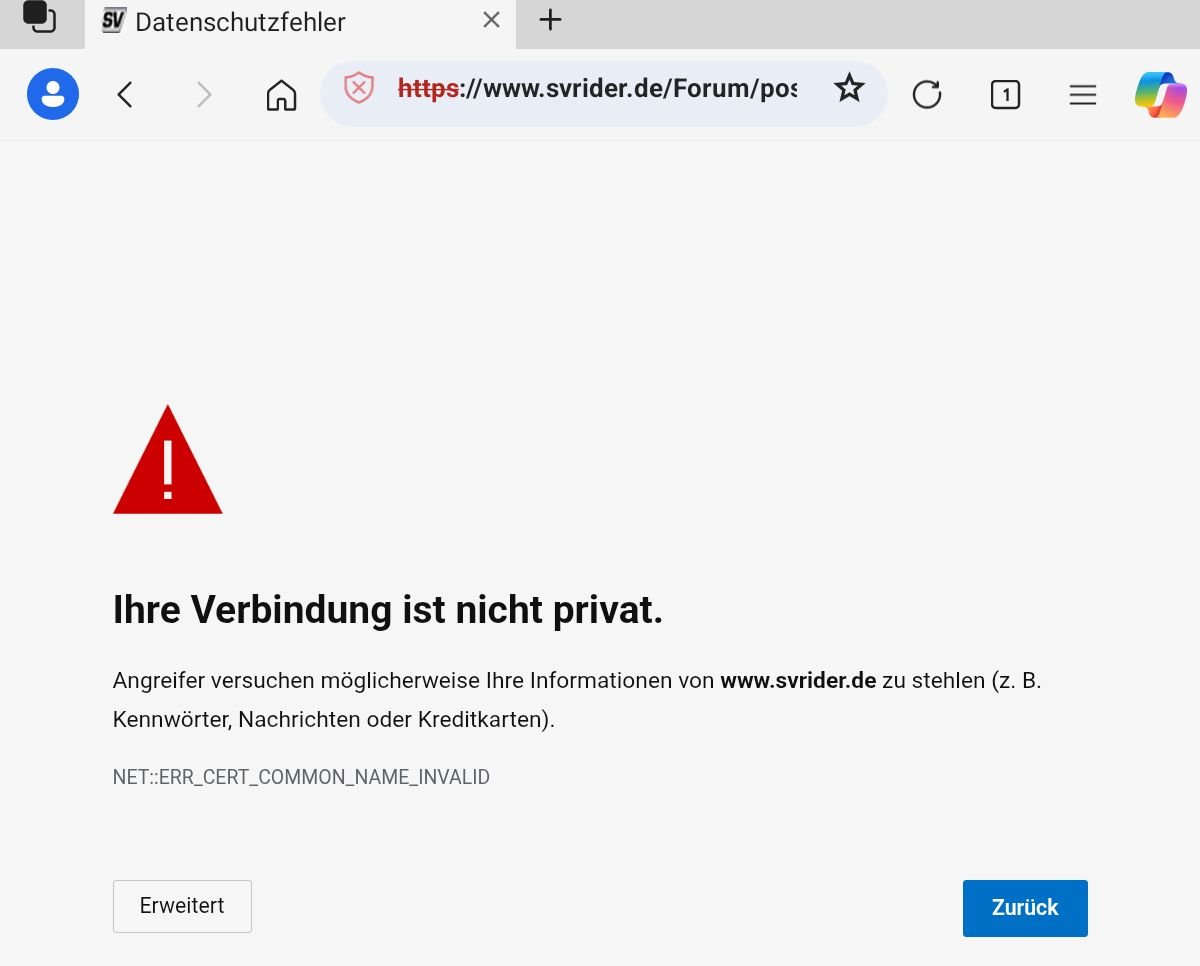 Eben, und wenn man sich das Zertifikat anzeigen läßt, steht dort als CN nur "svrider.de", korrekterweise müsste das Zertifikat auf "www.svrider.de" ausgestellt sein.