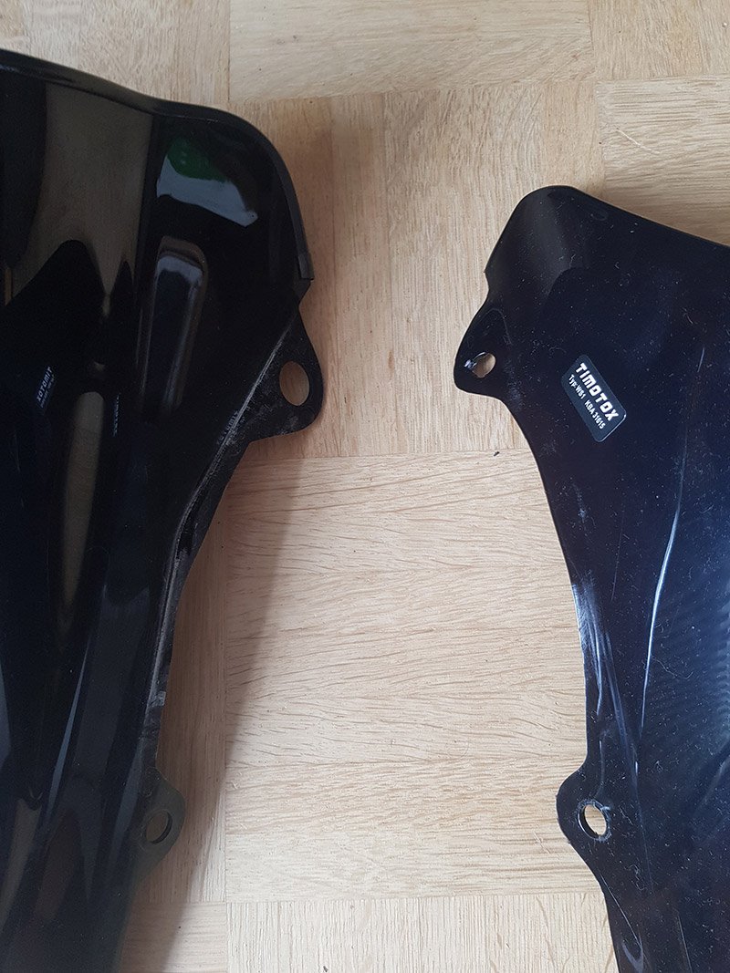 Die Scheibe von Bodystyle ist eine Chinascheibe mit KBA Nummer, identisch mit der regenbogenfarbenen Variante, die ich vorher (hochscrollen) als Bsp genommen habe. Die hat genau das Problem, was du mit den Bohrungen geschildert hast (siehe angehängte Bilder mit Vergleich MRA und TIMOTOX). Ich habe eine von Timotox, die ebenso ein Chinateil ist, allerdings hat die eine KBA-Nummer, leider nur als Aufkleber auf der Vorderseite. Die preiswerten Labels sind alles Chinascheiben mit KBA.