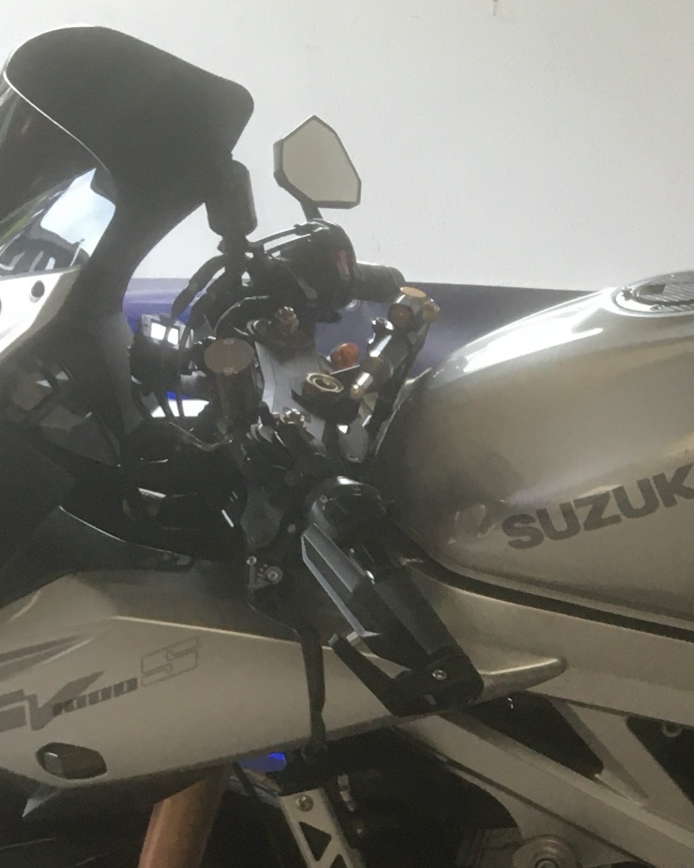 Auch interessant! Wo wird der denn Gabel/Lenkerseitig befestigt? Am rohrlenker per Schellen oder irgendwie an der Gabelbrücke? Denn diese ist ja eine Superbike Gabelbrücke von ABM für die GSXR (da gsxr Gabel). Braucht man da eine Mischung der Teile aus den Montage Kits für SV und gsxr?