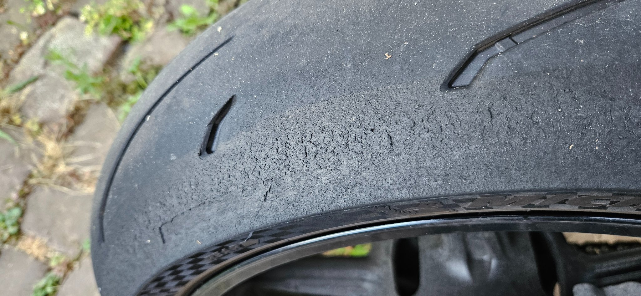 Zu warm-kalt kann ich nur sagen, dass ich die 2,3/2,5 an dem Morgen, als ich zur Arbeit gefahren bin, bei 10-15°C (es waren 10°C aber das Moped stand in der Garage, wo es ein kleines bisschen wärmer war) und im Schatten eingestellt habe. Da fühlte sich der Vorderreifen für meinen Geschmack noch recht weich an (nicht negativ vom Fahrverhalten aber man hat bei Asphaltkanten deutlich gespürt, wie er nachgibt). Bei der Vogesentour lag die Außentemperatur bei 25-30°C, mit dem was dann an Erwärmung dazu kommt, müsste der Druck also etwa 10% höher gelegen haben. Letzten Endes auch egal. Fahrverhalten war gut und das Ablaufbild ist optimal. Der S22 (auf VTR 1000F) von dem einen und der Sport Attack 4 (auf Tracer 900 GT) von dem anderen Mitfahrer haben deutlich mehr gelitten (In Bezug darauf, wie sie aussahen. In Bezug auf den absoluten Verschleiß habe ich natürlich keine Ahnung. Bei beiden weis ich nicht, mit welchem Reifendruck sie unterwegs waren.), dabei bin ich auf den Pässen immer vor gefahren und habe dann oben gewartet.