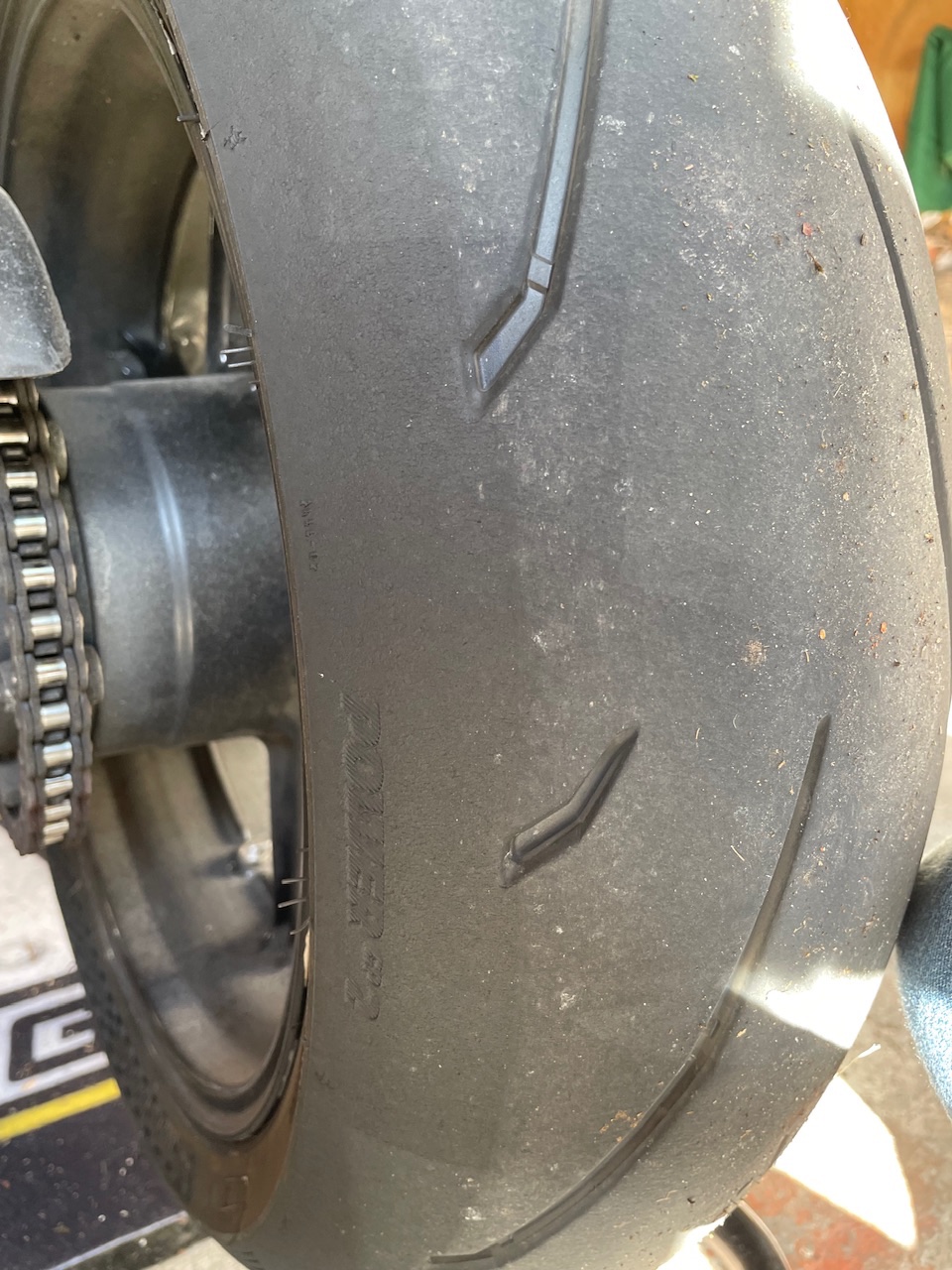 Das Ablaufbild sieht für meinen Geschmack sehr schön aus. Der Hinterreifen ist sehr glatt, der Vorderreifen auf der äußeren Mischung etwas rauer. Wenn man einen Pass hochgefahren ist, war danach der Hinterreifen auf der äußeren Mischung auch angeraut aber nicht wild. Der Vorderreifen hat jetzt am inneren TWI 4,3mm, am äußeren 3,3mm (neu: 5mm, 4mm), der Hinterreifen an beiden Messpunkten 4,5mm (neu: 5,5mm).
