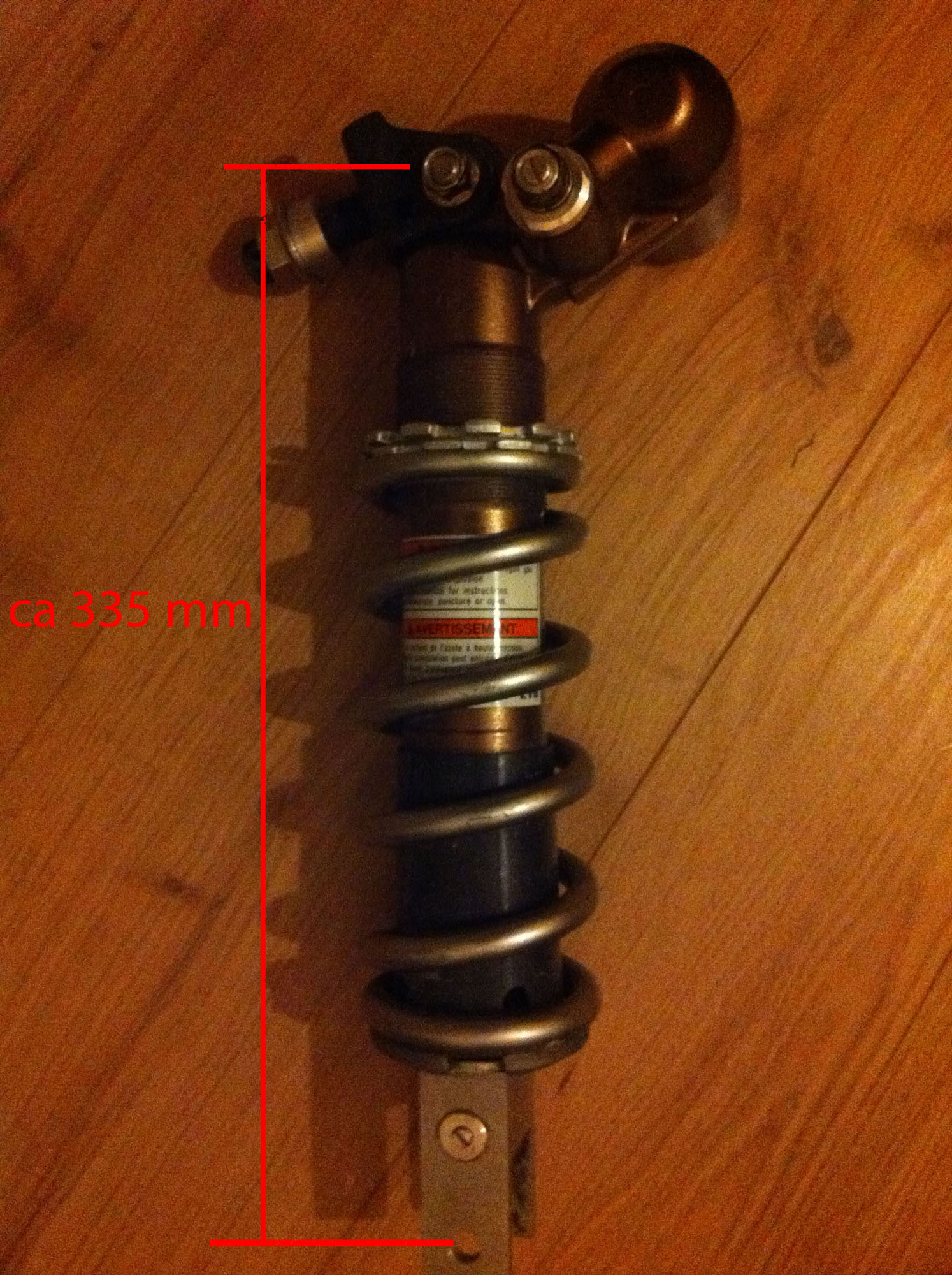 Serie bei Deinem Federbein: 330 mm. Das ist das Maß zwischen den Mittelpunkten der oberen und unteren Aufnahme.