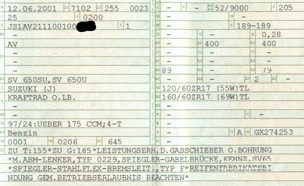 3. Motorräder, die eine Reifentypenbindung eingetragen haben, aber schon den Rechtsvorschriften der EU-Richtlinien 97/24/EG unterliegen (EU-Abgasemissionen im Fahrzeugschein Punkt 1 bzw. Zulassungsbescheinigung Teil 1, Punkt 14) und/oder eine Erstzulassung ab 11/2000 haben, werden genauso behandelt wie EU-Zulassungen (Typengenehmigungen). Eine Reifengrößenänderung hat keinen Einfluss auf eine Reifentypenbindung. :D