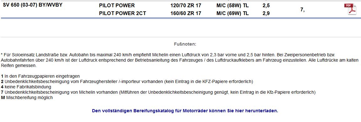 Und sieheda, in den Reifenfreigaben endlich das * gefunden und da steht noch immer:Mayachill hat geschrieben:Für den Luftdruck hab ich jetzt noch mal auf der Michelin Homepage in den Freigaben geschaut. Für die SV650s Kante ist in der Tabelle der Luftdruck mit 2.5/2.9 angegeben, allerdings steht oben an der Tabelle ein Sternchen und unten im Kleingedruckten findet sich dann: