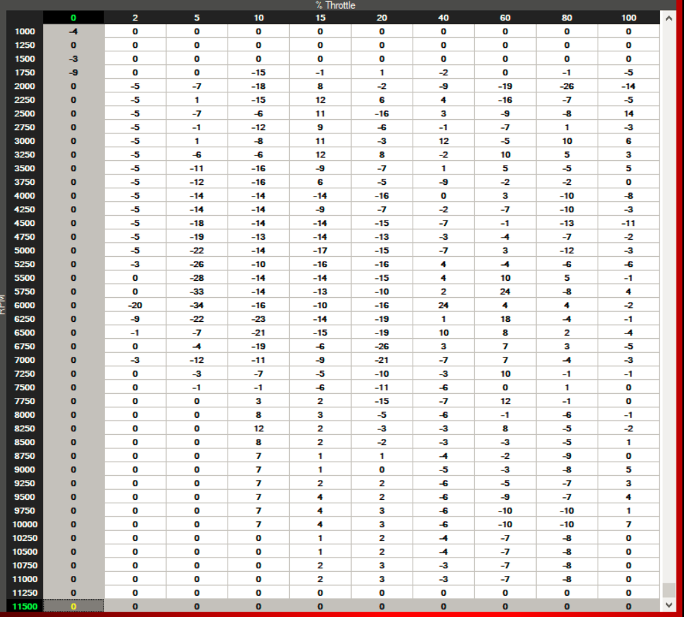 Die Zünderkerzen in Fahrtrichtung sehen wie folgt aus: Die AFR Tabelle aktuell: Das entsprechende Mapping: