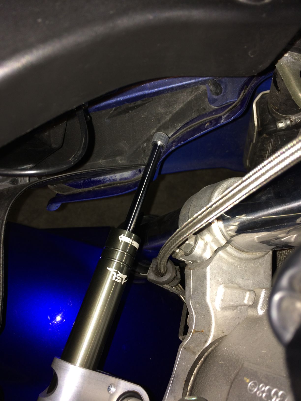 Meine Vollverkleidung steht an der vorderen oberen Seite etwas weit nach innen. Der LSL hat einen längeren Hub(also die Stange ist länger) als der Originale. Deswegen wurde die Freigängigkeit des Dämpfers bei mir bei vollem Rechtseinschlag durch die Verkleidung behindert.