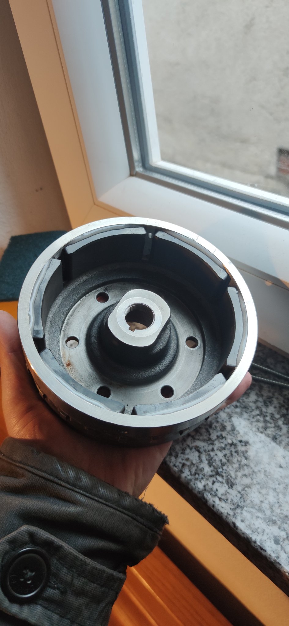 Ich wollte ein kleines Update zu meinem Rotor geben. Der ist nun auf dem weg zum neu verkleben, auswuchten und erleichtern. Nach 18 Jahren und 49000km waren alle Magnete locker und haben nur noch durch den Magnetismus am Rotor selbst gehalten.