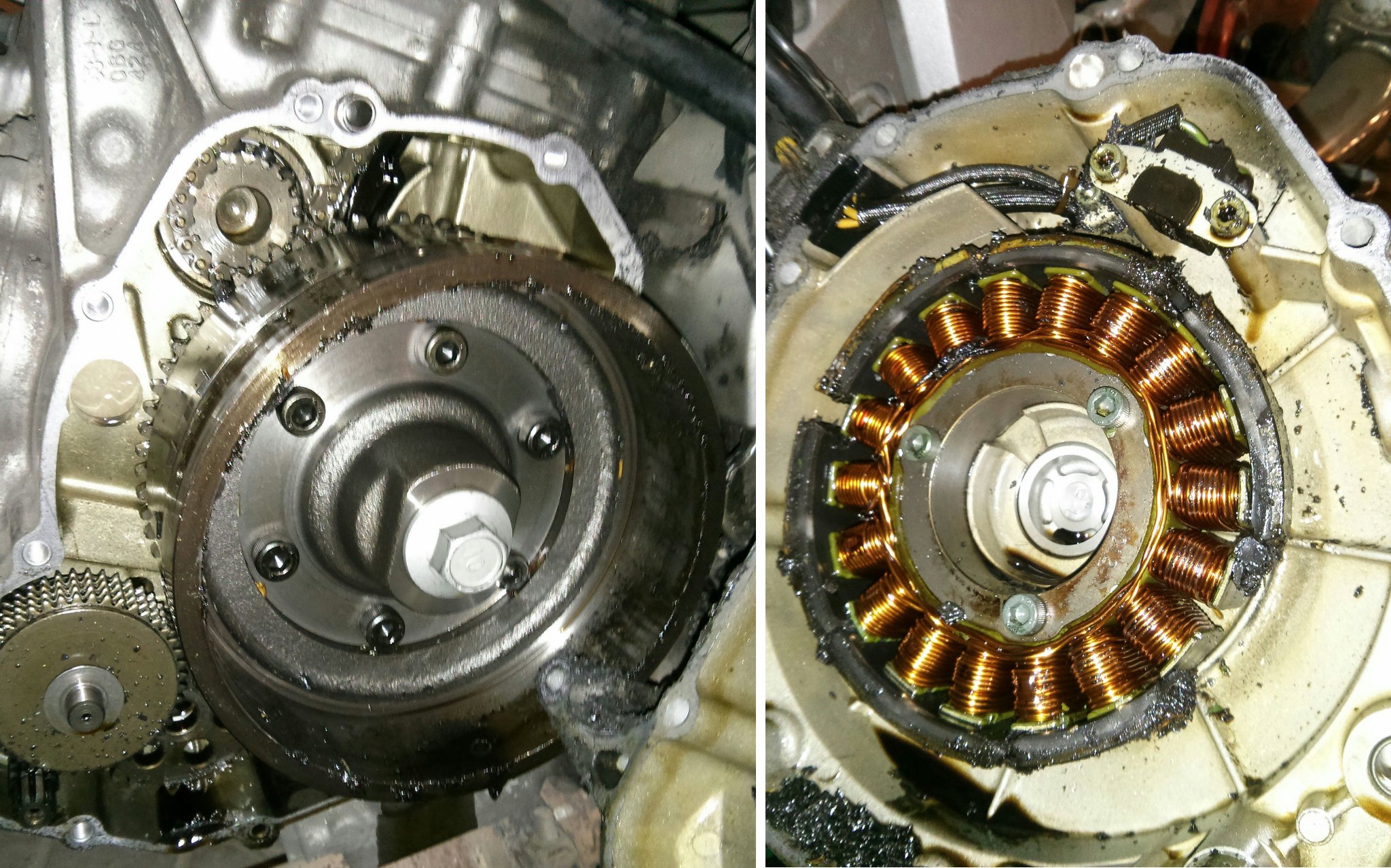 Das war auf jeden Fall aller höchste Eisenbahn was zu machen. Wenn mehrere Magneten verschiebbar sind, können sie sich irgendwann übereinander schieben und dann geht der Spaß erst los. Dadurch kann es zur Berührung mit dem Lichtmaschinen Stator kommen und die Magnete werden zu glasharten Bröseln, die sich im Motor verteilen und überall anhaften. Hier ein unschönes Beispiel: