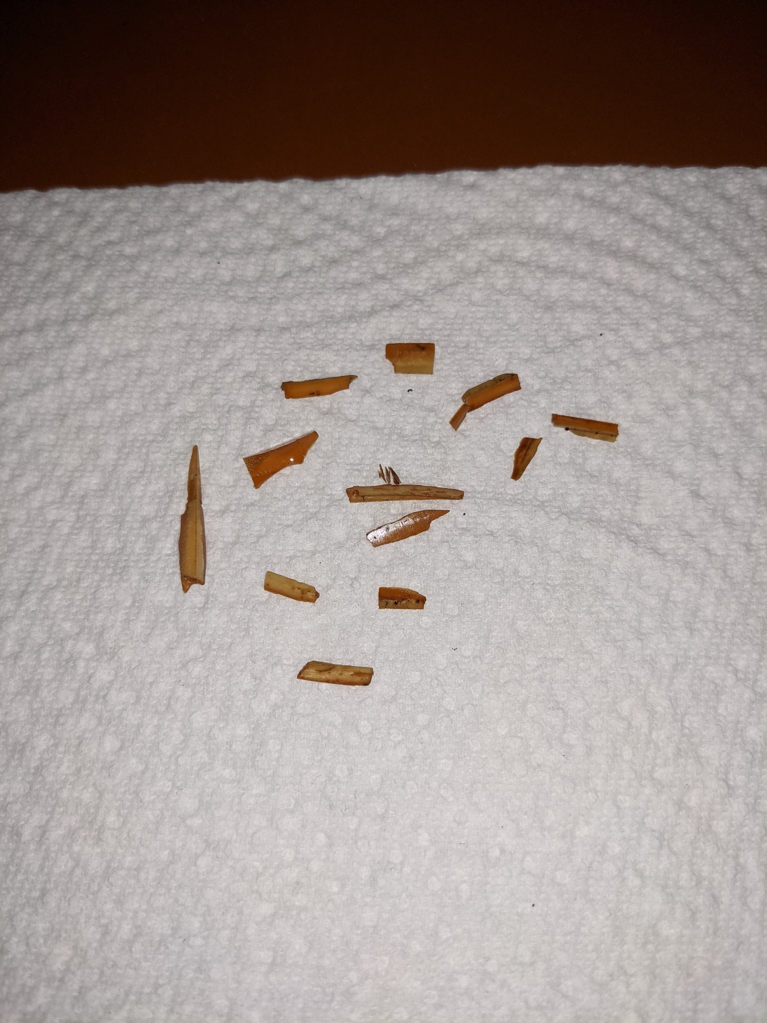 Die Stücke sind recht hart und spröde, auf einigen (z.B. dem in der Mitte, mit der Reflektion) sind die Abdrücke von leicht rauhen Oberflächen erkennbar, schaut mich etwas an wie die Rückstände einer maschinell bearbeiteten Form.