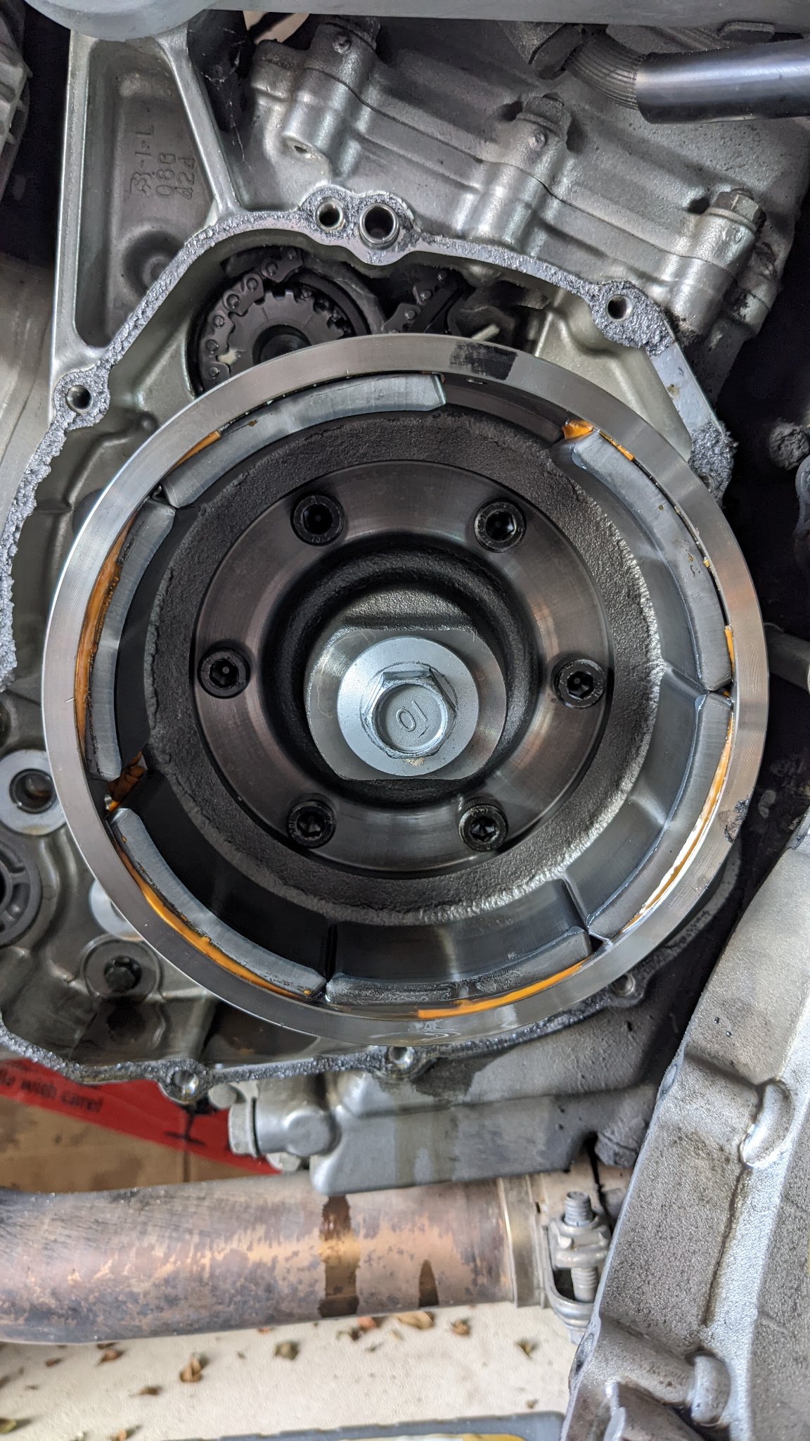 Zwischenzeitlich war ich zu vorsichtig und dachte der Rotor wäre evtl. zusätzlich mit den sechs Inbusschrauben fixiert und habe die vorsorglich gelöst. Wäre nicht nötig gewesen, aber geschadet hats vermutlich auch nicht. Jetzt ist der Anlasserfreilauf halt im Motor geblieben.