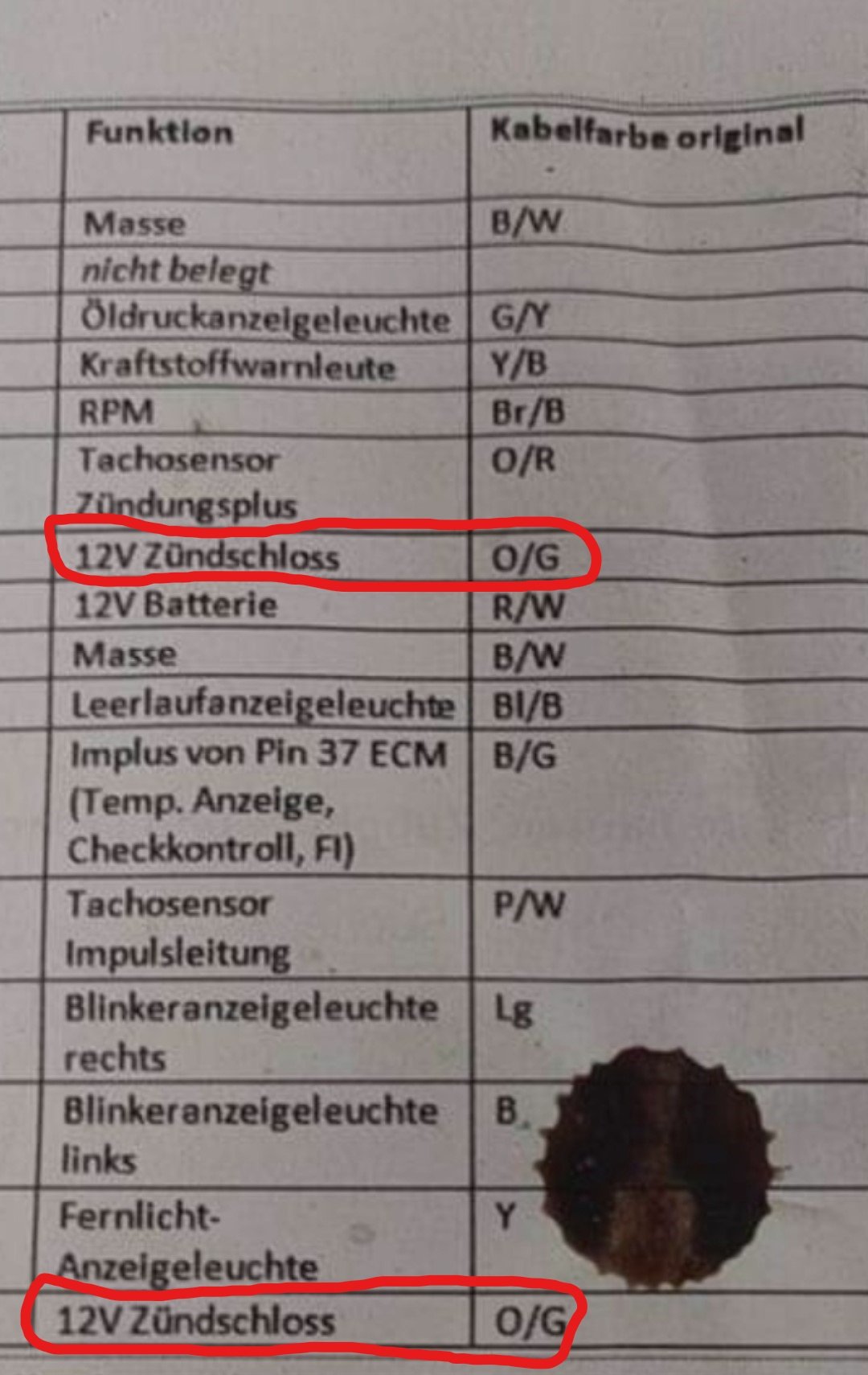 Jetzt habe ich aber zwei mal 12V Zündschloss am Tachostecker (Orange/Grün)