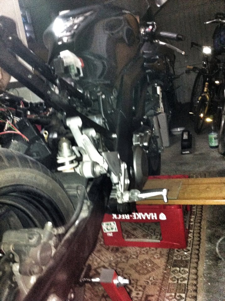ich würde an die Achse der Schwinge gehen, ne Stange durchschieben, szeht ja schräg auf dem Seitenständer.