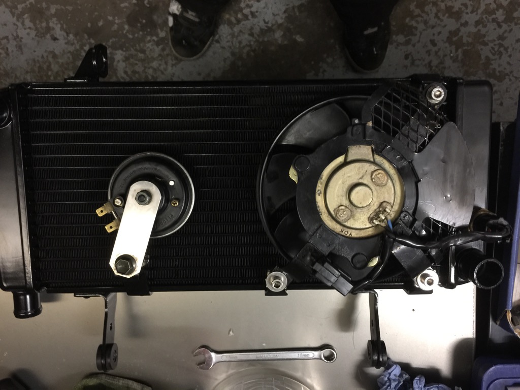 Der neue Kühler mit den alten Teilen (Thermoschalter, Lüfter + Hupe):