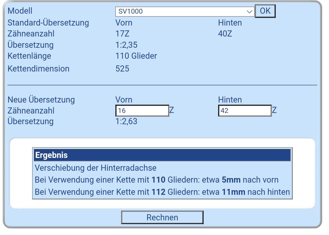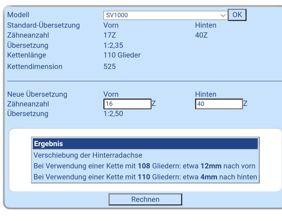 Vielen Dank !!!Dieter hat geschrieben: ↑25.09.2021 23:16Es gibt bei www.kedo.de unter "Tipps und Tricks" einen Kettenrechner. Der beantwortet die Frage und sagt wie weit die Achse je nach Kette und Übersetzung ihre Lage ändert.