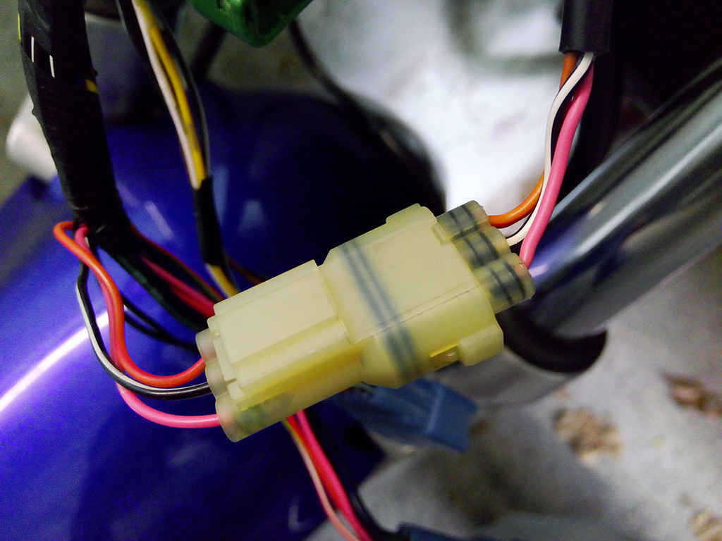Um den original Tacho-Anschlussstecker der Kante bzw. Knubbel zu verwenden, welcher nur Geschwindigkeit (rosa/weiß bzw. rosa) und Geschwindigkeit "+" (orange/rot) für den Tachosensor hat, könnte man doch hier direkt den braun/weißen und rot/weißen anschließen, denn über den dritten fließt der Strom doch einfach nur Richtung Minus, also Fahrzeugmasse, was beim Tacho dieselbe sein sollte wie am Bike selbst?