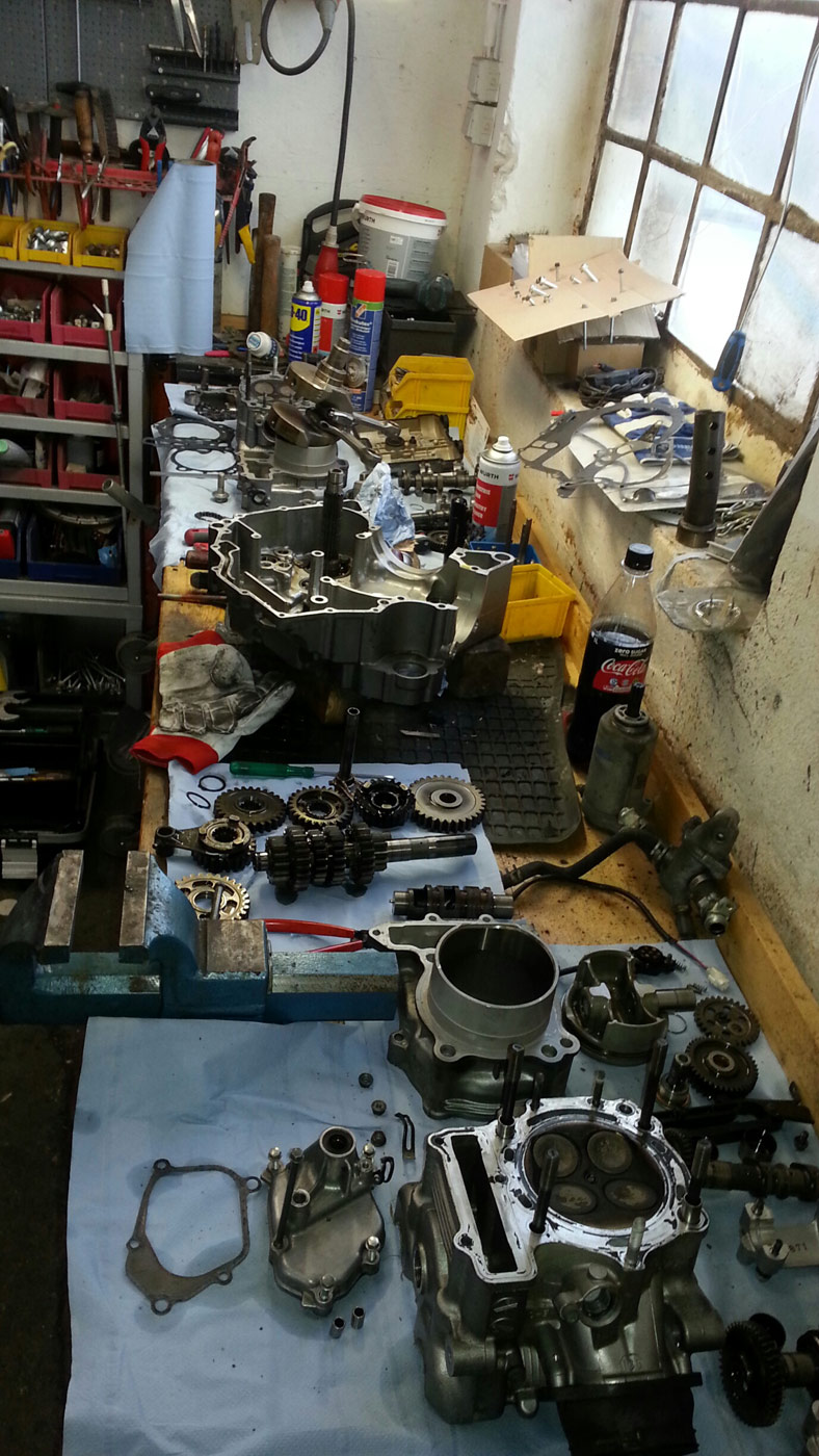 Zur Zeit sieht es etwas chaotisch aus auf meiner Werkbank, ich glaube so viele Einzelteile eines Motors haben da noch nie gelegen :mrgreen: