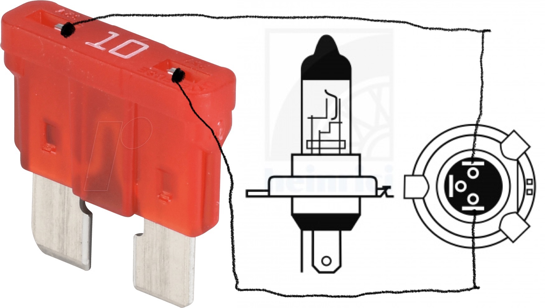 Eine der durchgebranntem Sicherungen etwas Draht und eine Lampe vom Hauptscheinwerfer laut Bild anlöten. Solange der Kurzschluss besteht leuchtet die Lampe.