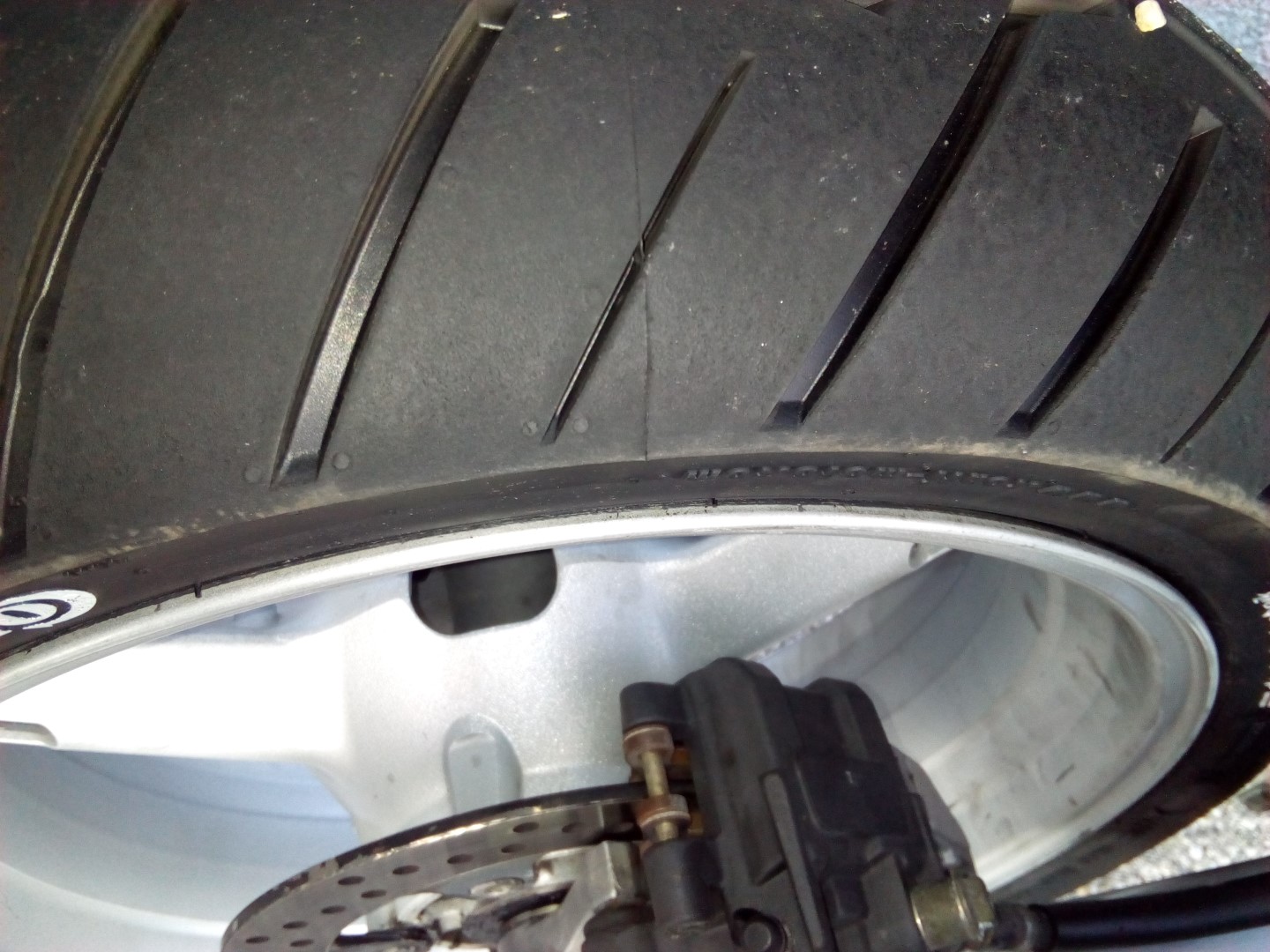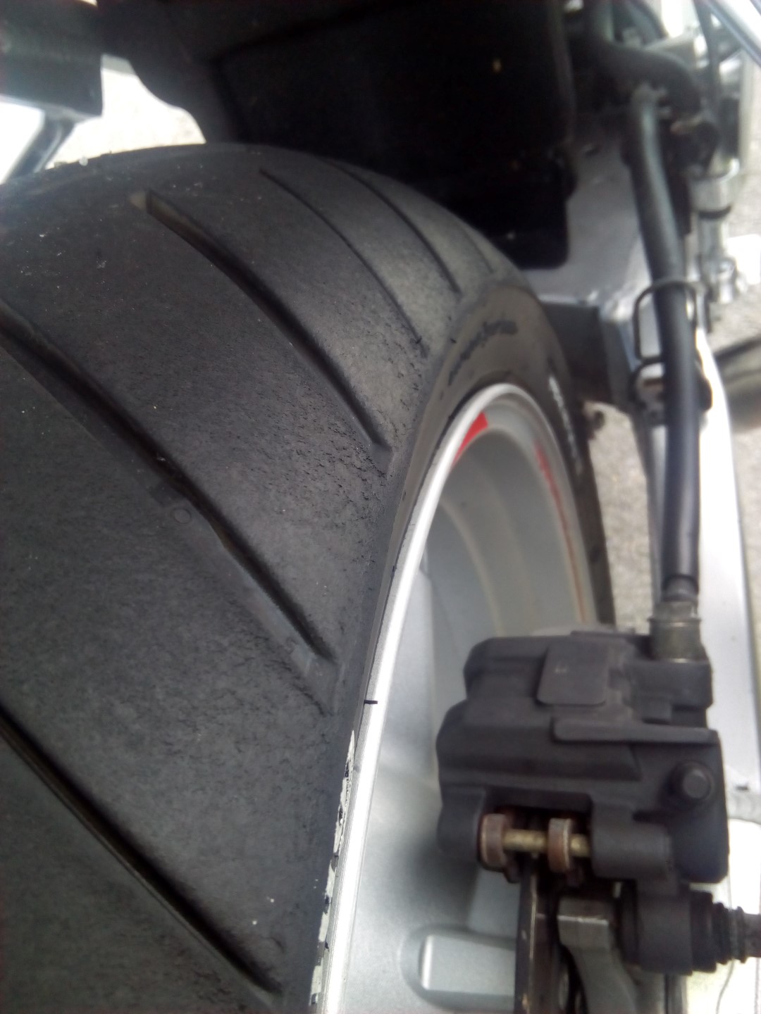 Für die meisten hier vermutlich aber auch noch interessiert ist die Laufleistung und das Abriebverhalten. Zum Abriebverhalten kann ich sagen, dass je kühler es ist und je härter man den Reifen ran nimmt, umso deutlicher löst sich die Oberfläche auf. Die nachfolgenden zwei Bilder zeigen den Hinterreifen bei ca. 16° Lufttemp. nachdem ich etwas zügiger mal die 15 Kehren von meinem Hausberg raufgejodelt bin: