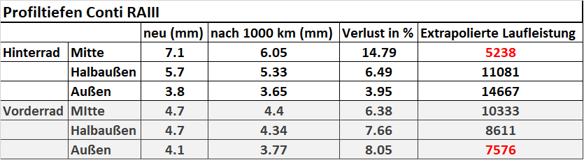 Aus den gemessenen Werten und der Annahme das bei 1,6 mm Restprofil schluss mit dem Reifen ist, habe ich außerdem eine MÖGLICHE Lebensdauer extrapoliert. Hier die Tabelle: