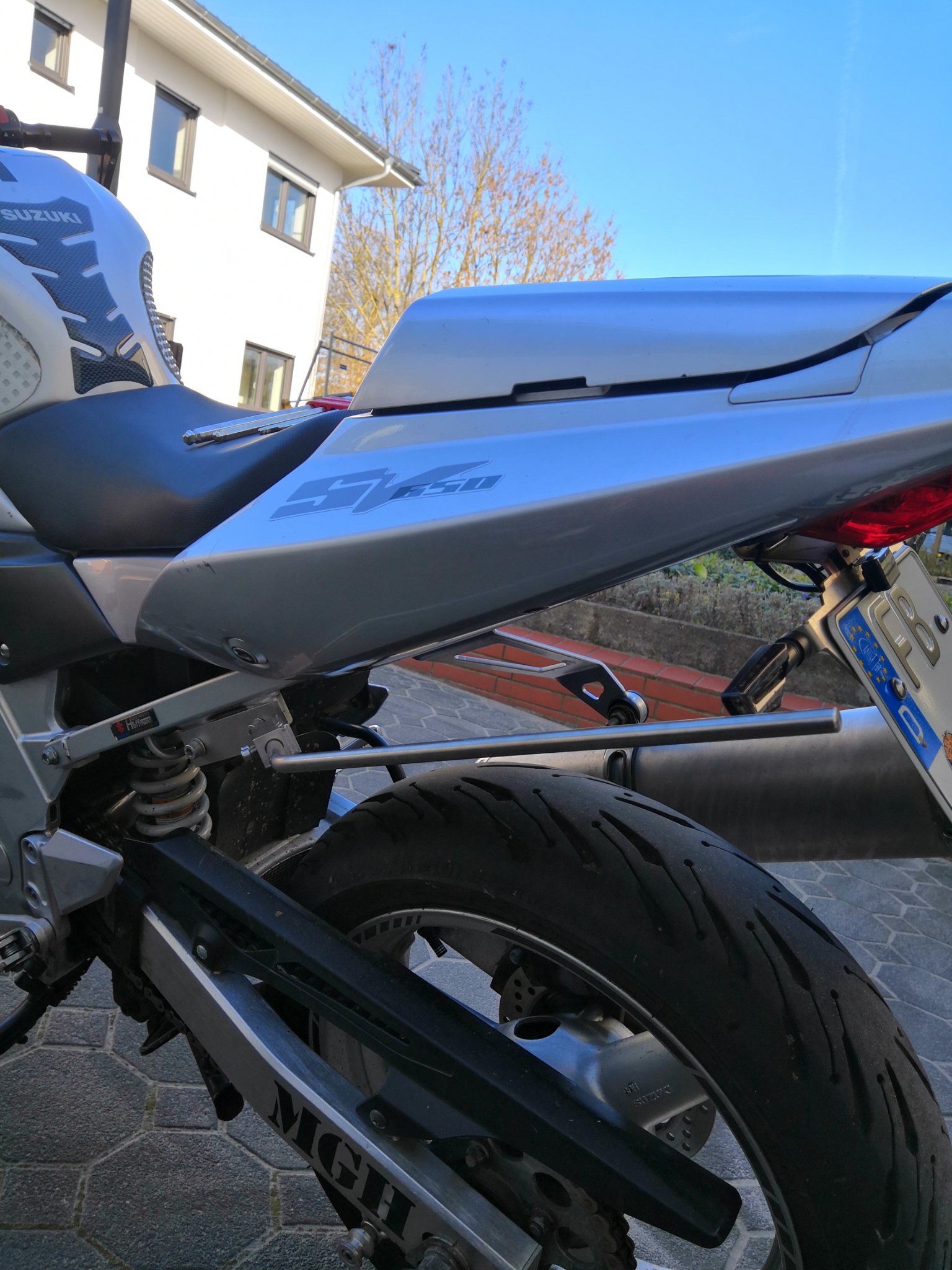 Ich hatte jetzt endlich mal Zeit in Ruhe ne Runde zu basteln und hab mir Abstandshalter für Satteltaschenzusammengebrutzelt weil das sonst in Verbindung mit nem kurzen Kennzeichenhalter alles iwi nicht so wirklich passt. Die Taschen liegen an den Blinker an und klappen nach innen ein. Falls Bedarf an technischen Zeichnungen besteht kann ich die gerne nachreichen