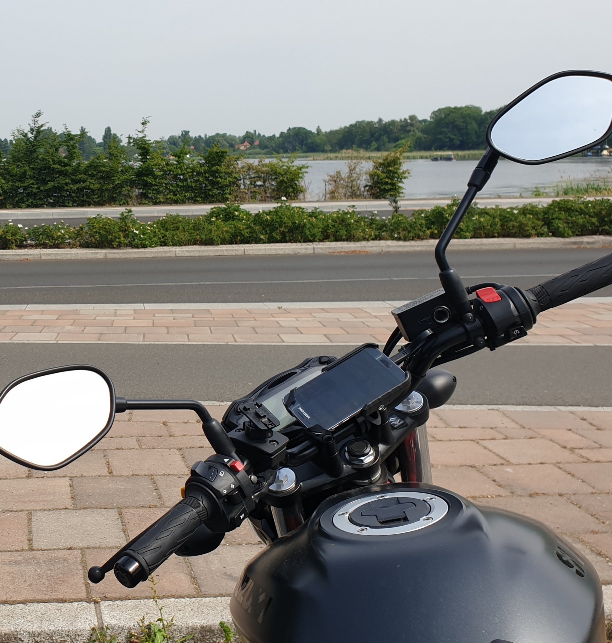 Angebracht ist die Halterung genau mittig vom Lenker, das sieht auf dem Foto nicht so aus, aber wenn man das Telefon quer dreht hat man so keine Sichtbehinderung auf den Tacho, Smartphone und Tacho sind genau übereinander.