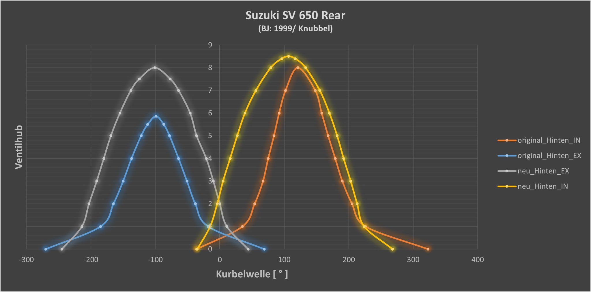 - Jetzt kommt der entscheidende Faktor. Müssen die Wellen umgepresst werden oder nicht? Entscheidend für den Drehmomentverlauf sind neben der Ansauglänge/ Durchmesser und Abgaslänge/Durchmesser die Steuerzeiten. Genauer gesagt, der Ventilschluss des Einlassventils. Für das Aulassventil ist der Hub im OT und die Überschneidung wichtiger. Je früher das Einlassventil schließt desto "früher" (niedrigere Drehzahl) liegt das maximale Drehmoment an. Dafür fällt es bei höheren Drehzahlen ab. Einlass-Kante und Einlass_Knubbel schließen zum selben Zeitpunkt. Perfekt!!! Der Drehmomentverlauf bleibt also annähernd wie bei der Serie. Die Einlass-Knubbel Welle als Auslass öffnet zum selben Zeitpunkt wie bei der Auslass_Knubbel Welle als Auslass. Dadurch bleibt die dynamische Kompression bestehen und wir können die Kompressionserhöhung zur Steigerung des Wirkungsgrades nutzen. Durch die Einlass_Knubbel Welle als Auslasswelle und die Einlass_Kante Welle als Einlass ist der Ventilhub im OT auf knapp über 2mm angestiegen. Das bringt nochmal ein Extra an Füllung im oberen Drehzahlbereich. Selbiges gilt für den hinteren Zylinder