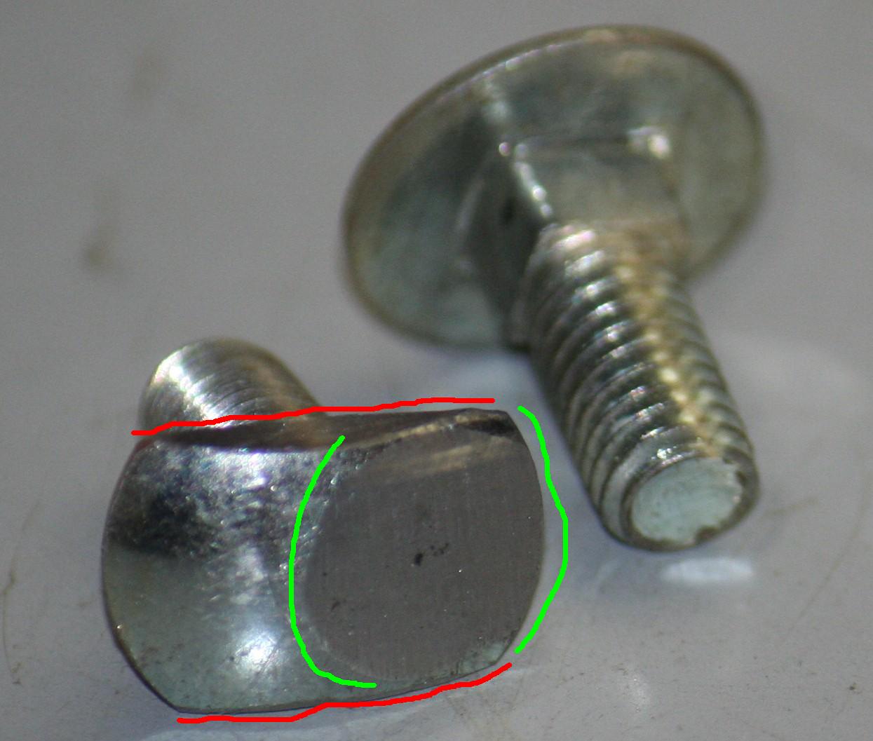 An den roten Markierungen habe ich den Kopf abgesägt, einfach mit der Eisensäge. Der Kopf ist dann noch ca. 10 mm breit. An der grünen Markierung habe ich den Kopf noch etwas flacher gefeilt, damit der Spiegelarm frei beweglich ist.
