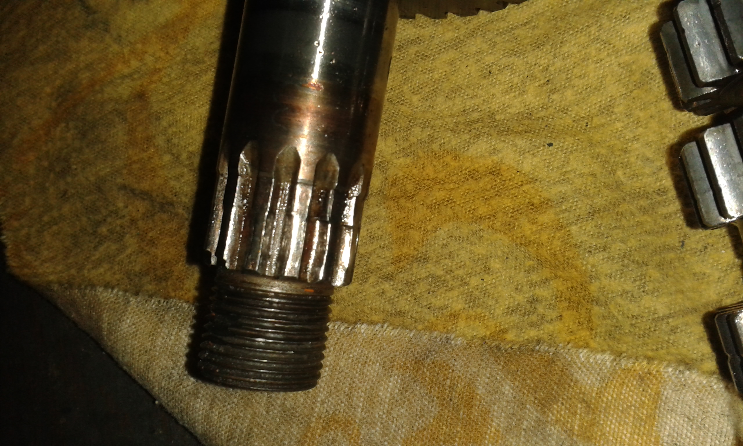 hier mal ein Bild von der kaputten getriebewelle mit der ich seit 2003 rumgefahren binDieter im Jahre 2003 hat geschrieben:Hab geschrieben das ich zurück auf Kette baue weil sich im Urlaub die Ritzelmutter gelöst hat (war fest und mit neuem Blech gesichert). Als es dann angefangen hat geräusche zu machen war die Welle schon etwas "angefressen". Bin noch gut nach Hause gekommen aber jetzt kommt die Kette wieder drauf weil die Welle dort noch in Ordnung ist wo das Ritzel sitzt
