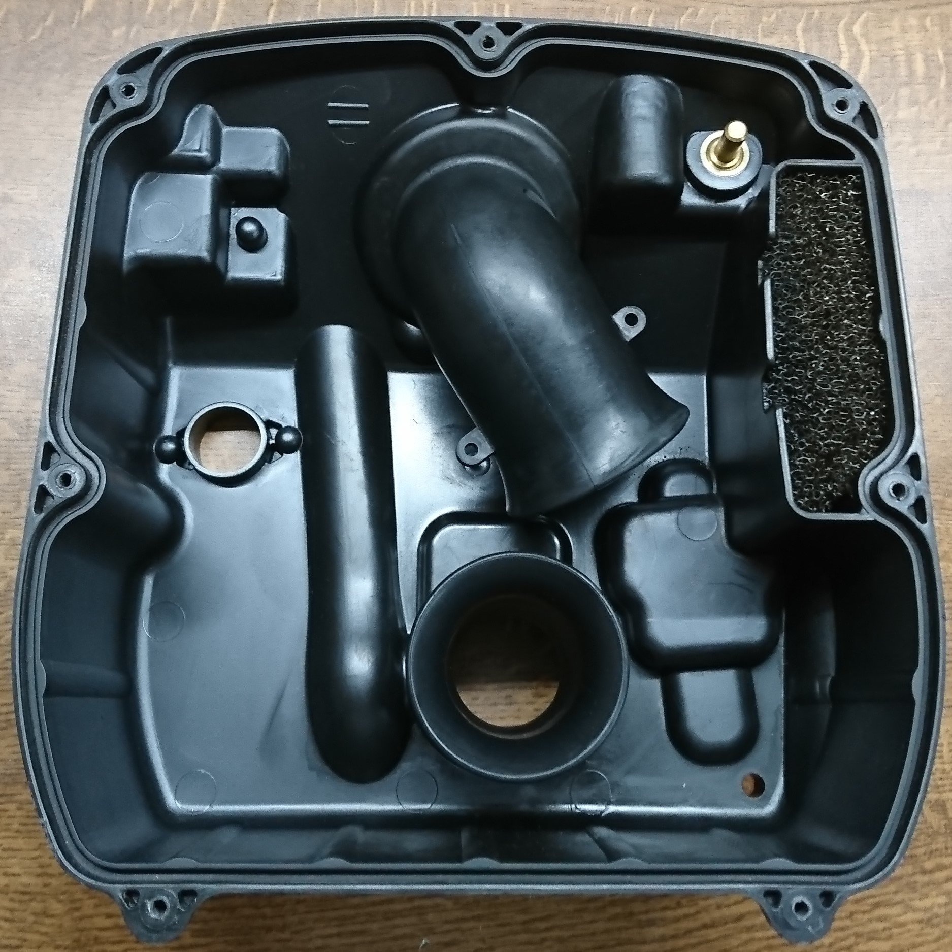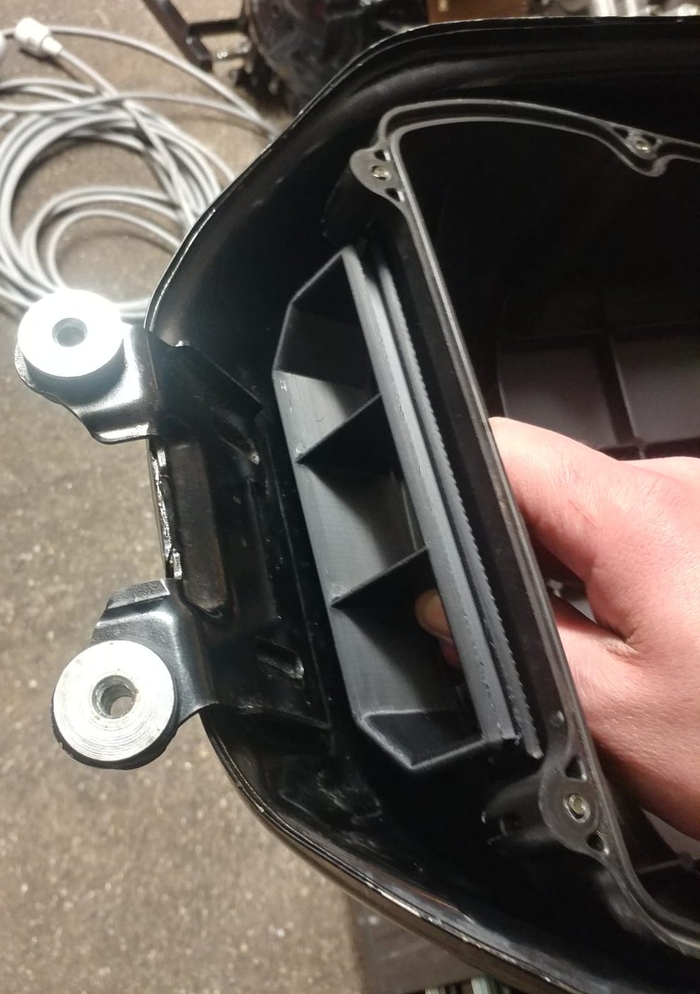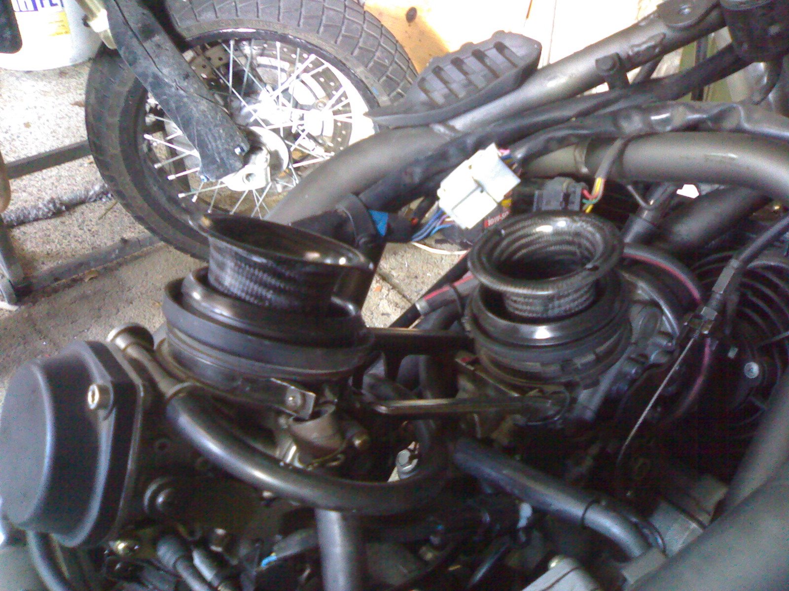 Vorteil, er saugt direkt von oben aus dem Tank Spalt (bisschen erhöhen lohnt sich dann) kühle Luft an und nicht unten die heiße Kühler/Zylinderkopf Abluft. Pro Grad mehr Temperatur verliert Luft 0,3% an Dichte. Als 30 Grad mehr sind gleich mal 10% weniger Sauerstoff zum verbrennen.