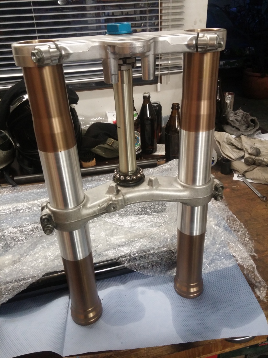 Ich entferne bei noch eingebauter Gabel das Vorderrad und die Bremssättel. Obere Klemmung lösen, die untere aber nicht. Nun die Stopfen lösen, nicht komplett rausschrauben sondern nur lösen.