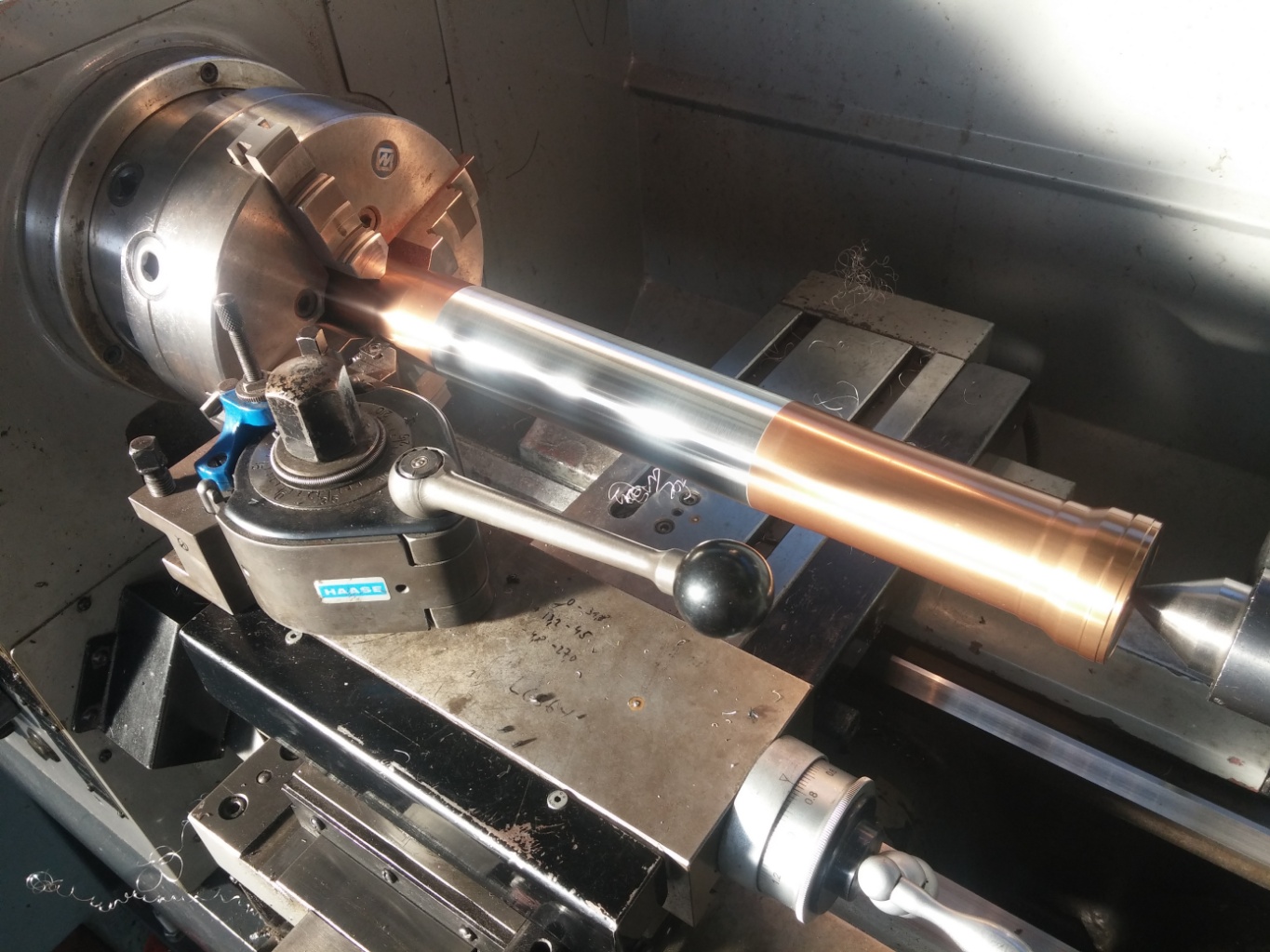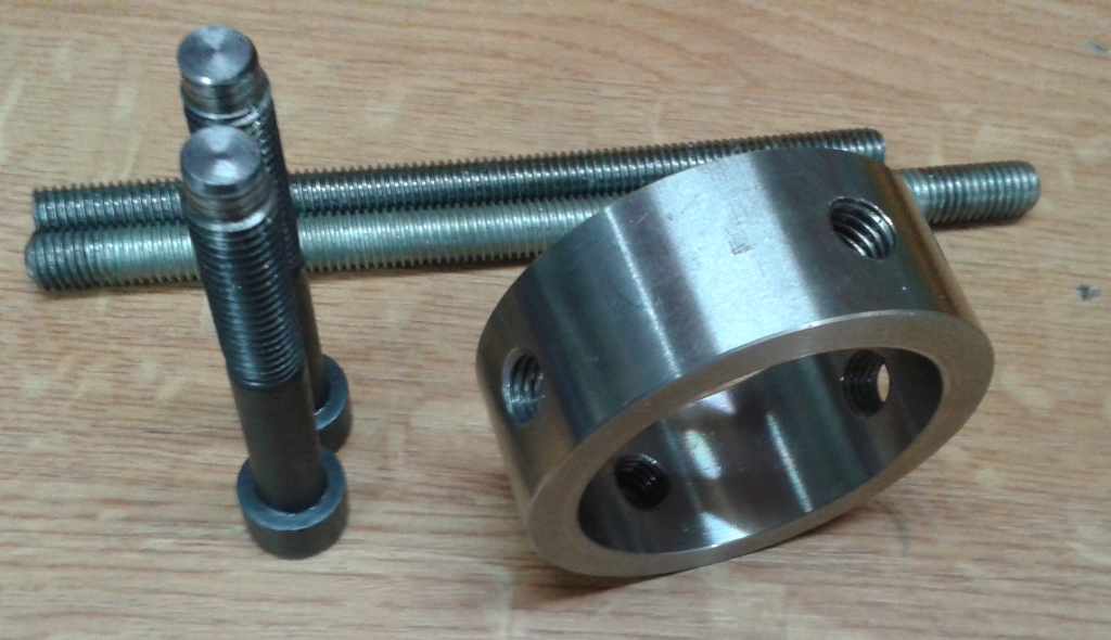 Dann noch zwei 150er Gewindestangen und zwei Schrauben. Abgedreht auf den Durchmesser der Vorspannhülse.