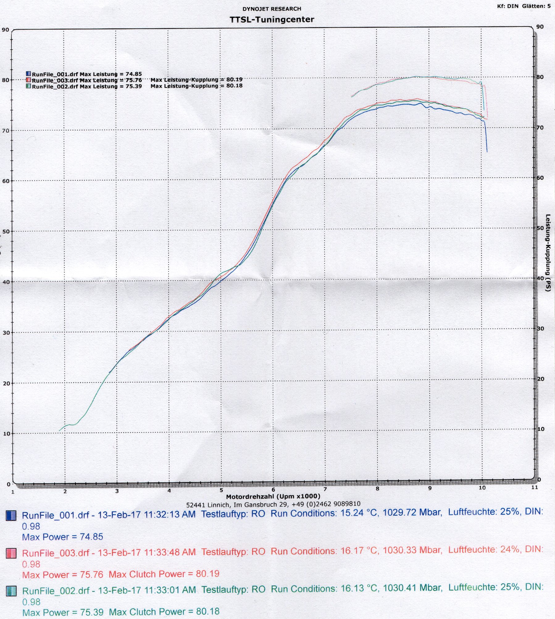 Habe also ca. 78PS am Hinterrad ... bedeutet ungefair 10% mehr an der Kupplung ..... über 90 Kupplungs PS bei 78PS Hinterradleistung sind sehr unwahrscheinlich ....