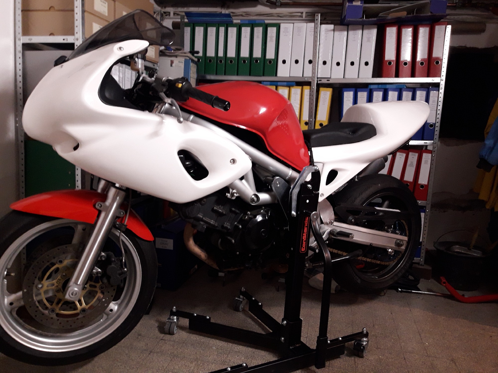 Leider sind nicht alle Arbeiten am Motorrad möglich, da der Ständer den Zugang zum Ritzel verdeckt. Das scheint mir bisher aber die einzige Einschränkung zu sein. Nee, Motorausbauen geht auch nicht,wenn der Ständer an einer Motoraufhängung fixiert ist.