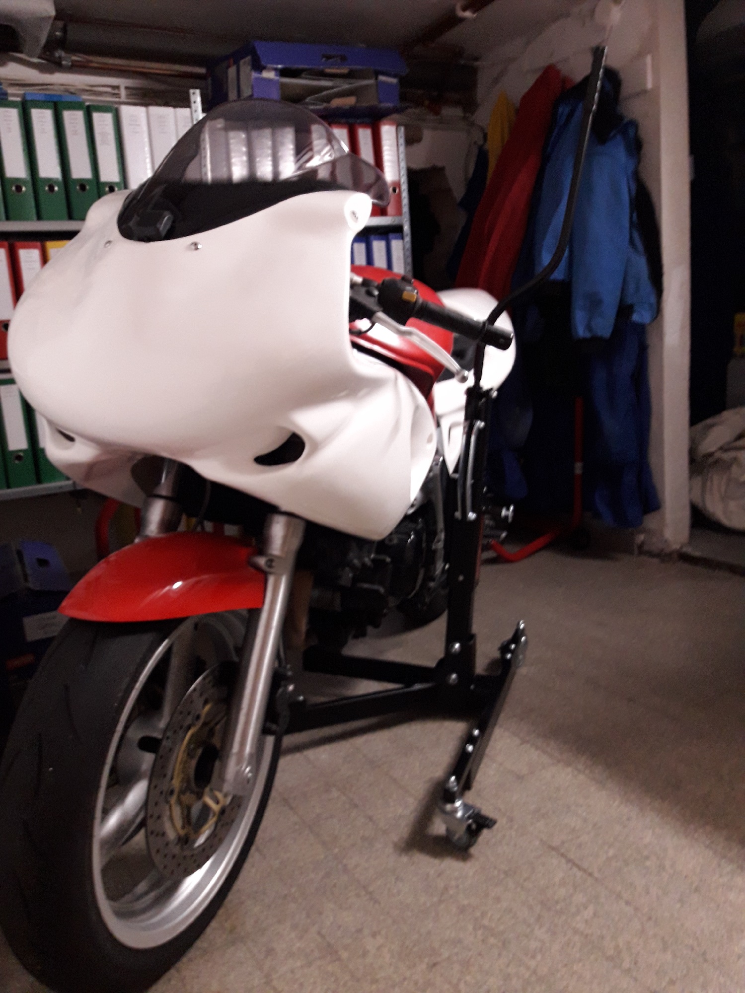 Auf der Renne fahre ich sowieso erst in die Vorderradwippe, da ich ohne Seitenständer fahre. Dann steht das Bike schon sicher und dann würde ich aufbocken.