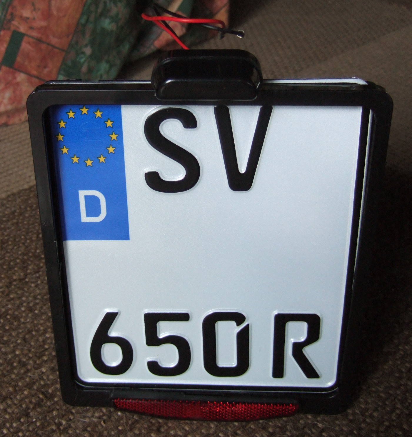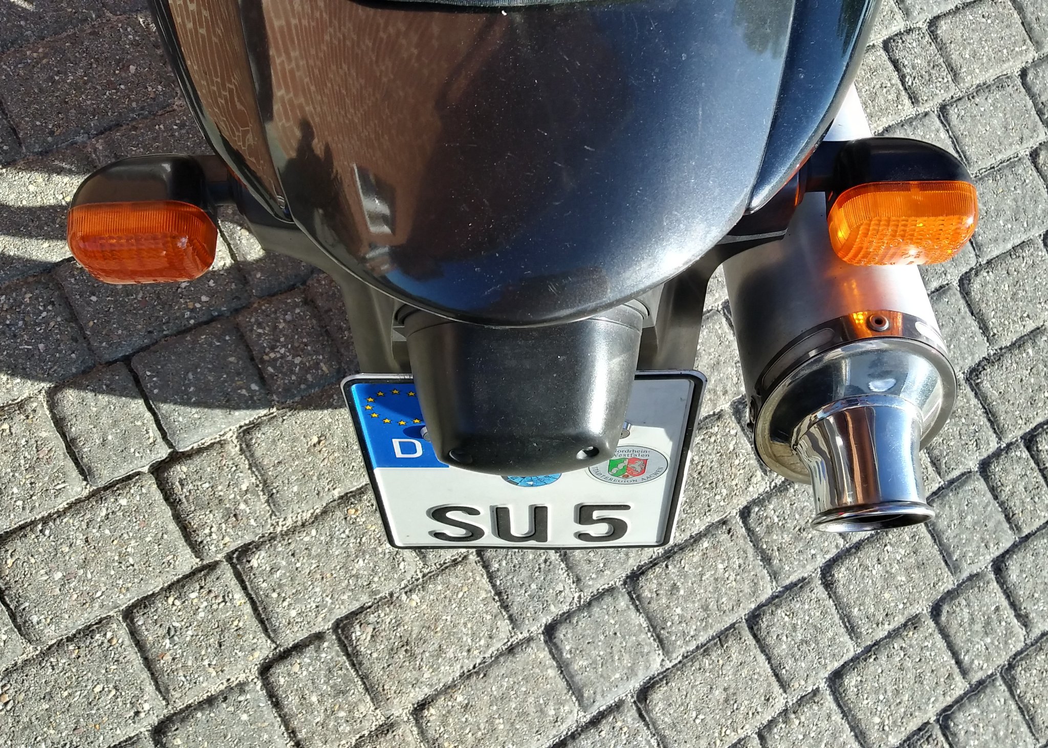 Danke für das Lob. Das Kennzeichen/Kunststoffhalter ist jetzt sehr weit unten mit nur zwei Schrauben an der Originalhalterung befestigt. Ich denke aber nicht dass das im Betrieb Probleme macht.