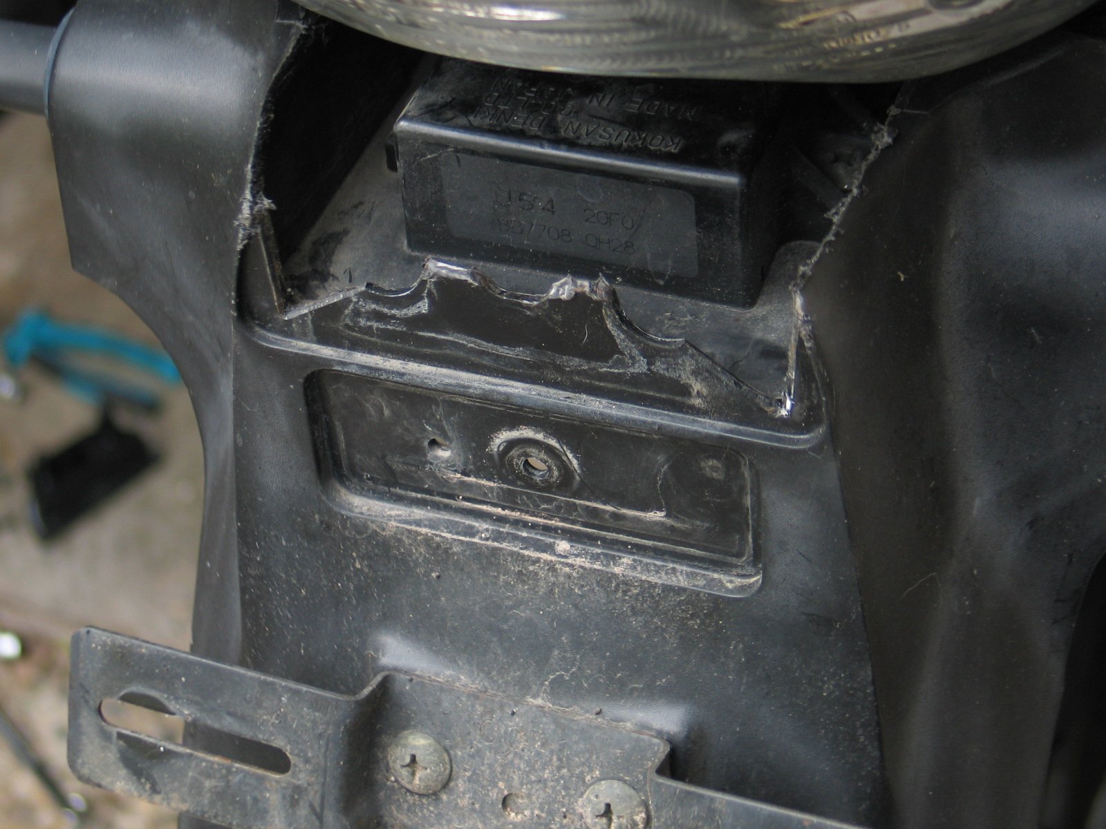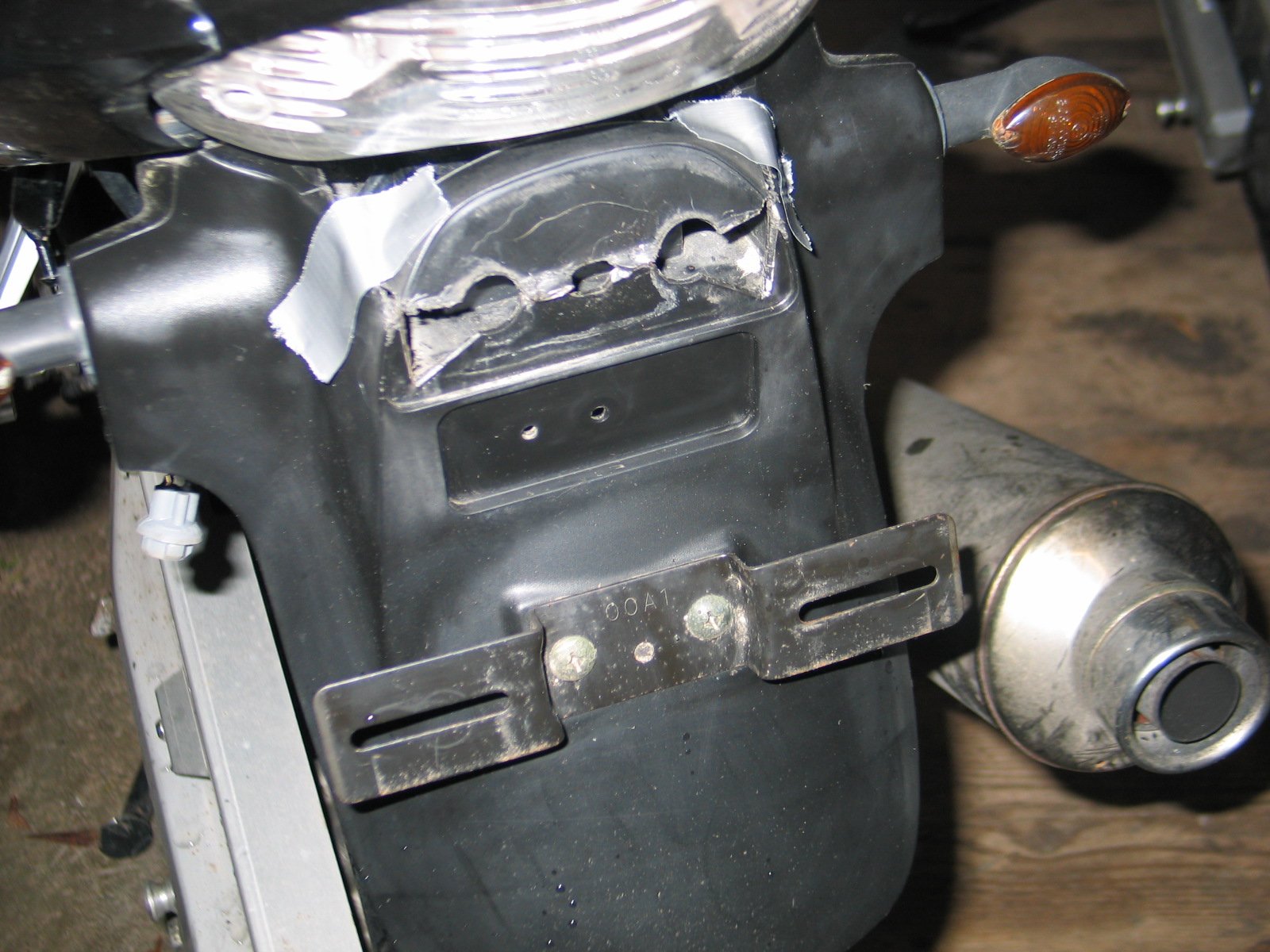 Da ist schon ein Kunststoffkennzeichenhalter dran. Man muss sich jetzt die original Kennzeichenbeleuchtung wegdenken und sich das Kennzeichen nach oben verschoben vorstellen. Das sollte mit geringem Aufwand und Einschränkungen schon ein deutlich besseres Bild ergeben. Habs mal hingehalten. Die Blinker werden (bzw. sind) natürlich auch noch (schon) durch kleinere Ausführungen ersetzt.