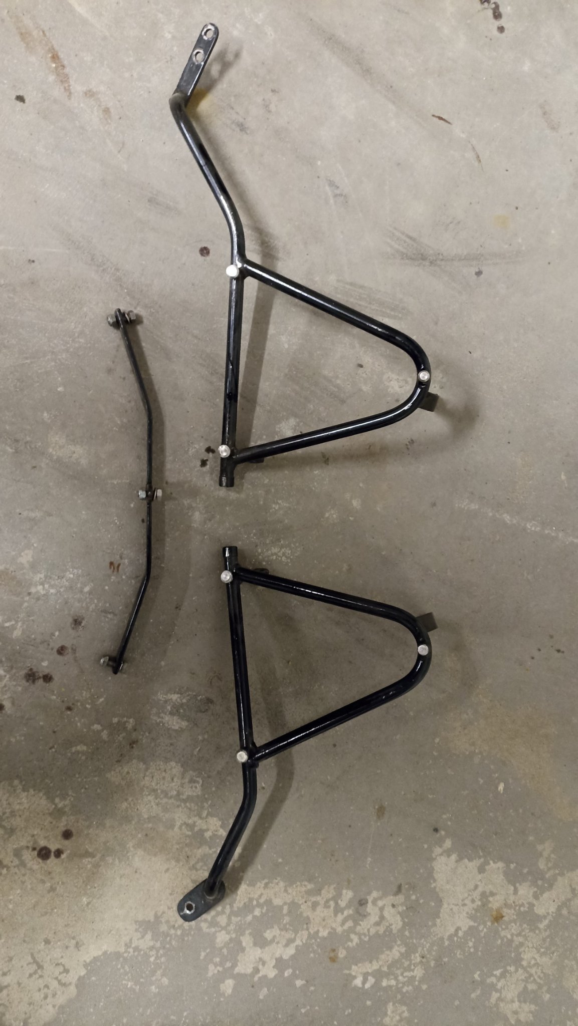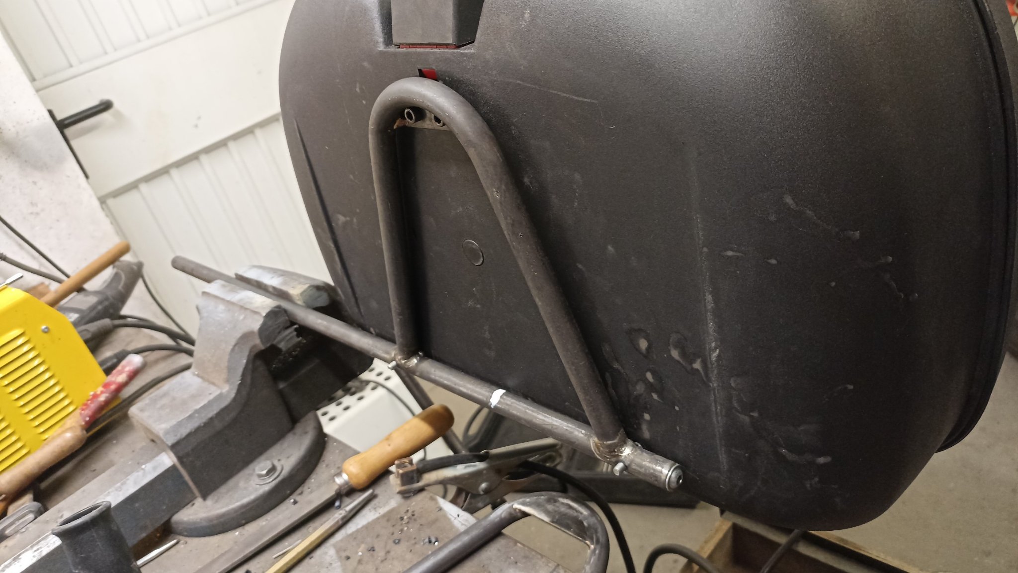 Jetzt zum Träger, ich baue die immer selber (gelernter Schlosser) aus ein paar Rohren und Flacheisen. Die Schnapper für die Koffer sind mit etwa 20€ pro Paar erschwinglich.