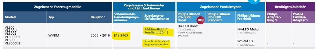 Ultinon Pro6000 moto H4 LED mit Zulassung für (der Rest, Modell, Typ und co. ist nur zur Info. Relevant ist in der Zulassung der Produkttyp des Leuchtmittels und die Genehmigungsnummer): In der SV ist ebenfalls der Stanley Scheinwerfer Stanley P0170 verbaut, aber auf dem Scheinwerfer stehen verschiedene E-Nummern!