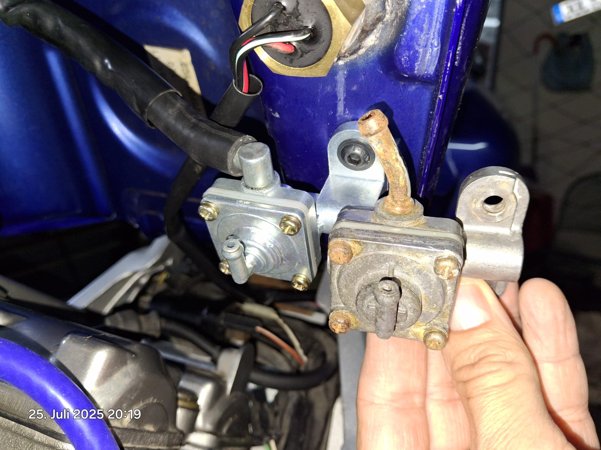 Zu "Reparatursatz" oder "neue Innereien in den Alten umbauen": Das hatte ich vorher auch überlegt, aber der Benzinfilter / Sieb am alten Benzinhahn existiert nach den 10 Jahren Standzeit quasi nicht mehr und den kann man (mindestens ich) leider nicht umbauen. Bei den Reparatursätzen ist der daher meines Wissens nach auch nie dabei.