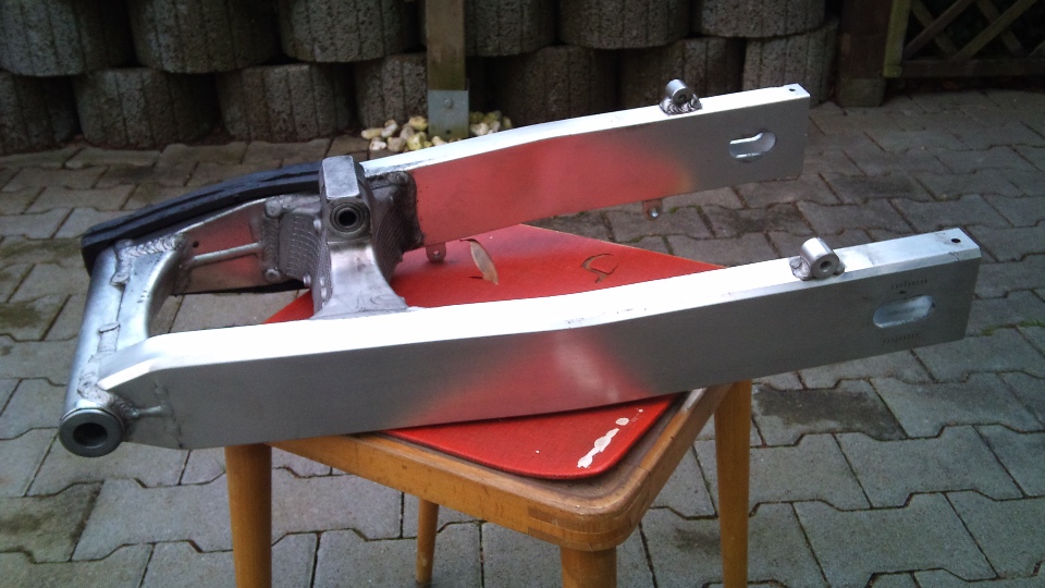 Hier eine Schwinge der K7. Diese habe ich genommen, da sie 4cm länger als meine ist und ich hoffe dadurch ein steigendes Vorderrad besser vermeiden zu können.