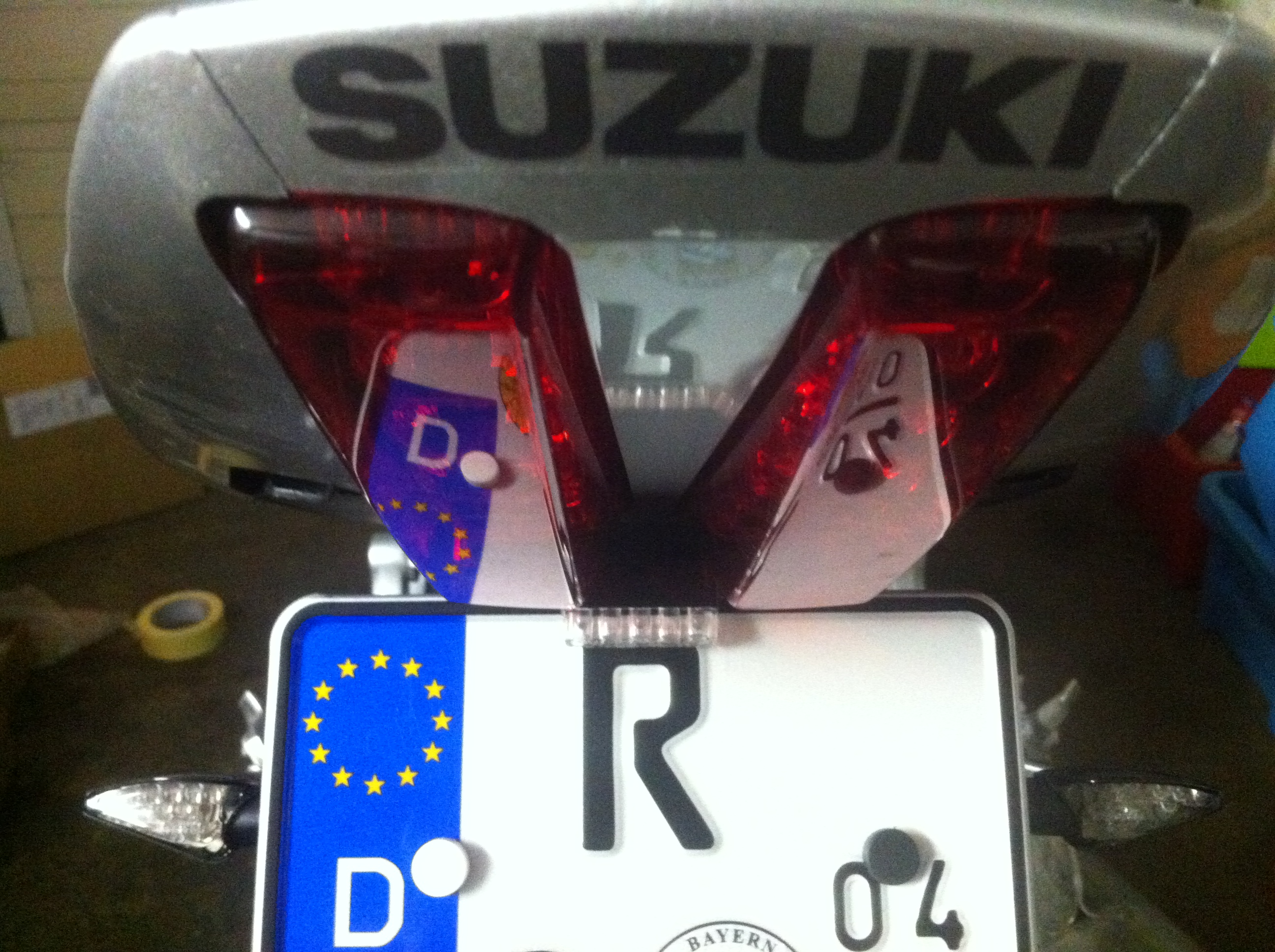 Quer passt die Kennzeichenbeleuchtung nach Anleitung von dem Bild umöglich hin. Allerdings könnt ich sie parallel zwischen die Rückleuchten machen. Eigentlich sollte nichts dagegensprechen, weil alle Bedingungen, wie z.B. den hinteren Verkehr nicht anstrahlen erfüllt werden...