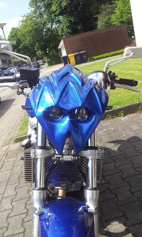 Ich habe mir eine Lampenmaske im Fighterstil mit 2x 50ér DE-Scheinwerfern verbaut...