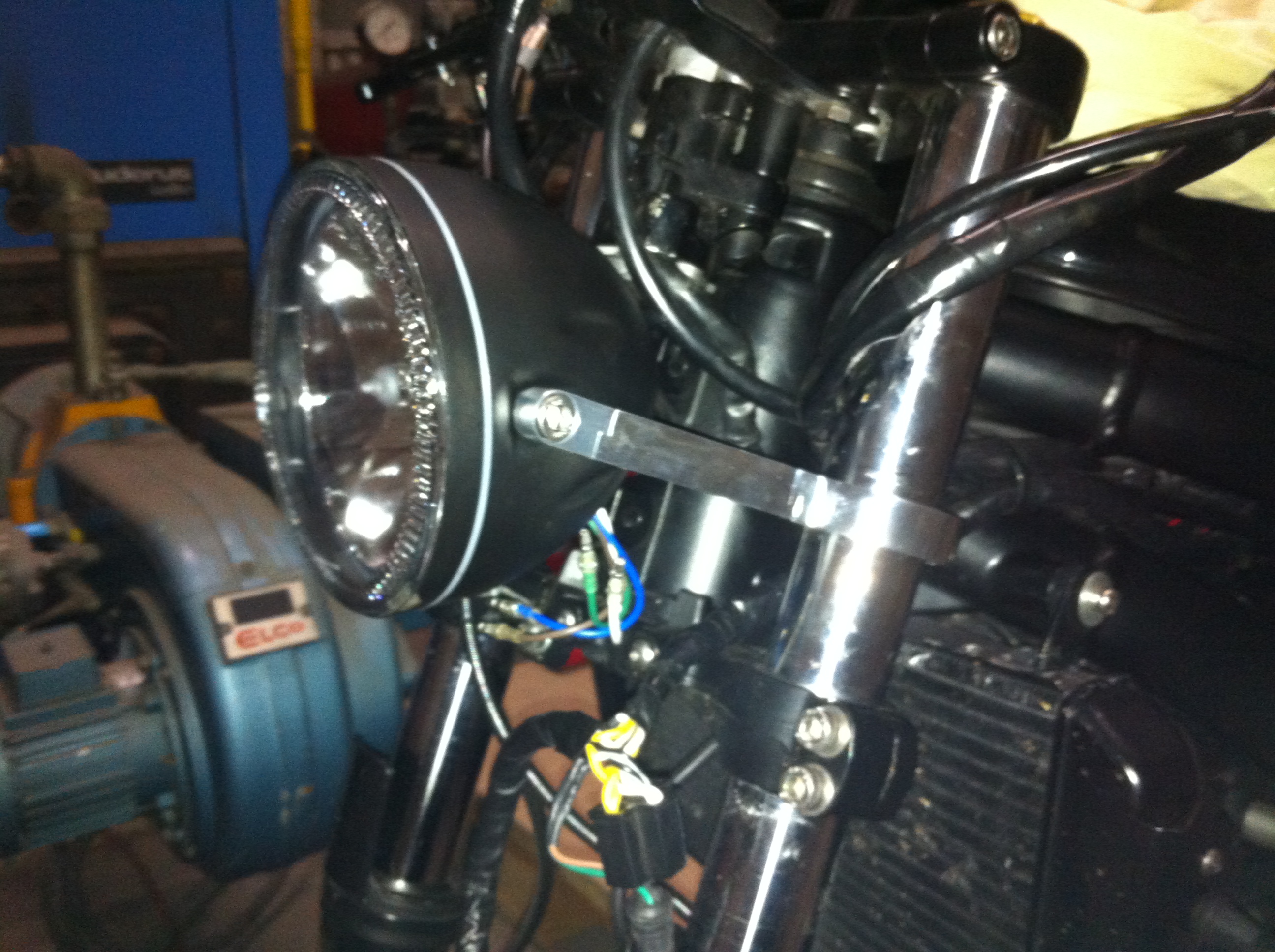 Den Halter hab ich noch schwarz eloxieren lassen, und den Tache versetzt und flacher angebaut. Das Problem bei dem Scheinwerfer ist, dass der ziemlich starr gelagert ist, und dadurch immer das Abblendlicht durchbrennt. Bin aber im Sommer auf meiner Kroatientour 4200Km nur mit Fernlicht gefahren, und das hält bis heute.